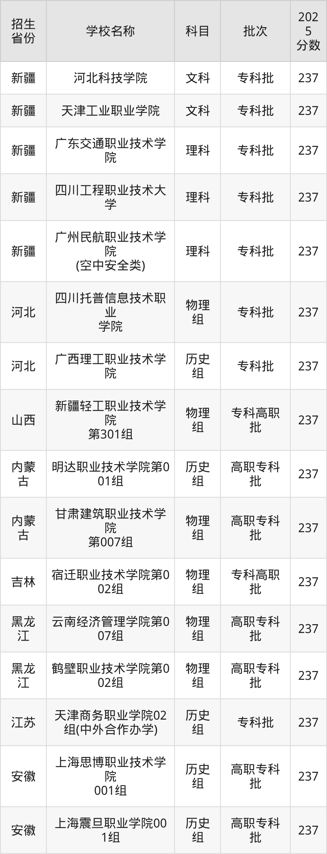 筛选全国各省2025年录取分数线为237分的理科大学如下: