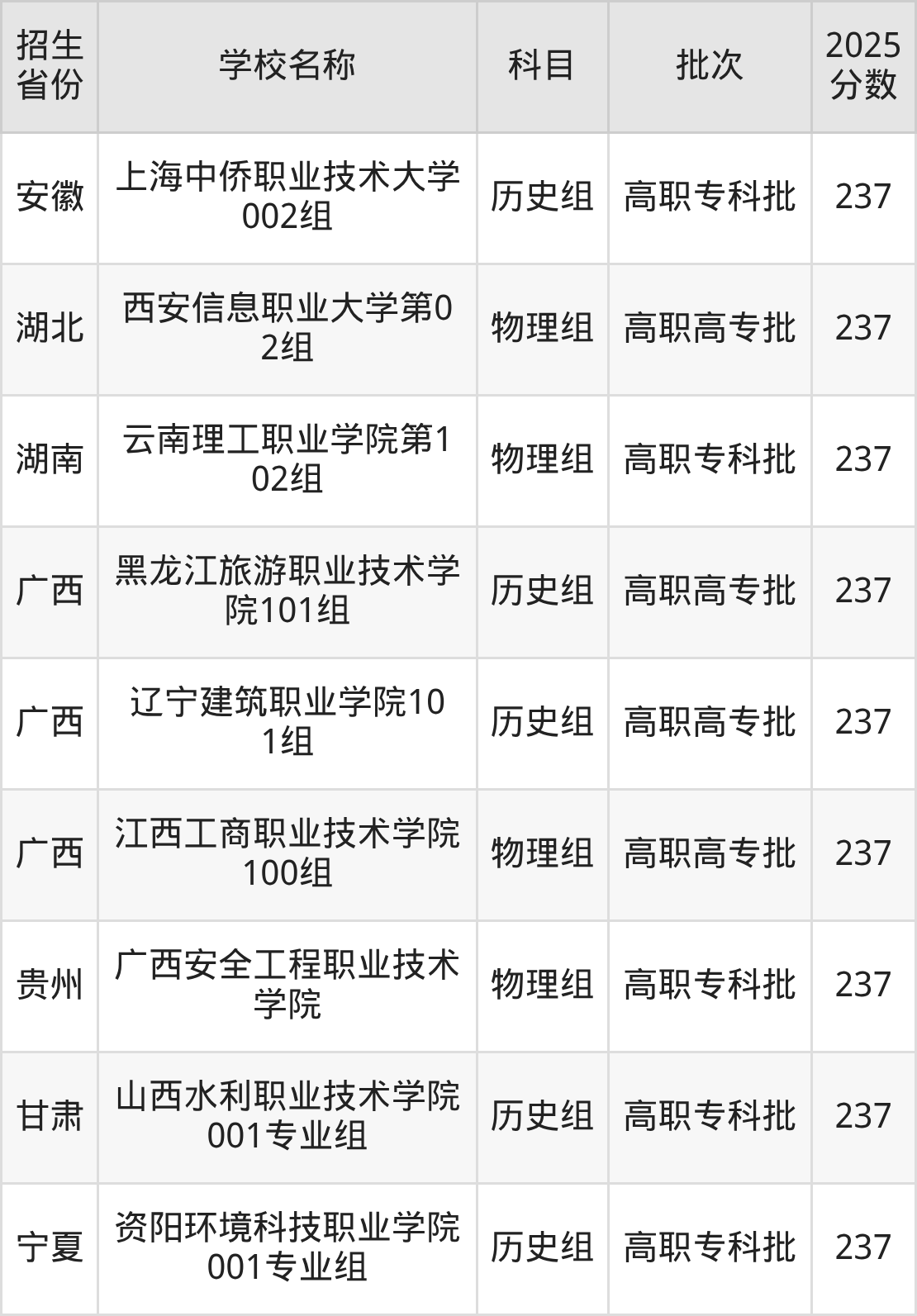 广西壮族自治区物理组分数线是237分的理科大学有:江西工商职业技术学院。