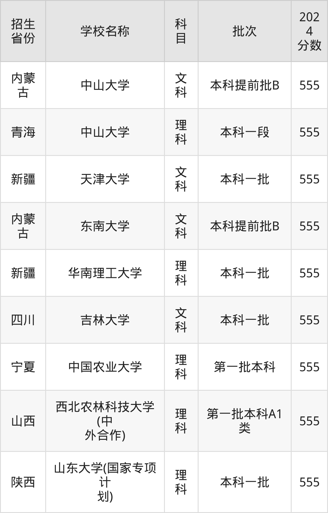筛选全国各省2024年录取分数线为555分的985大学如下: