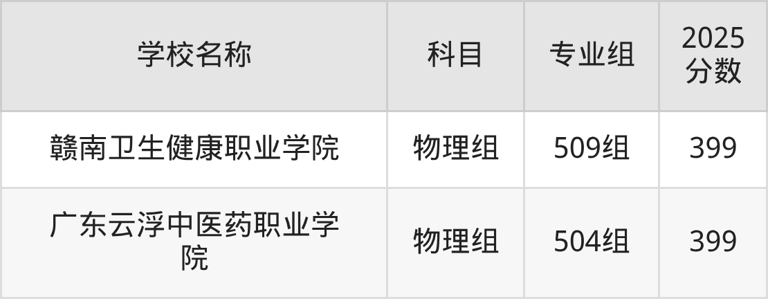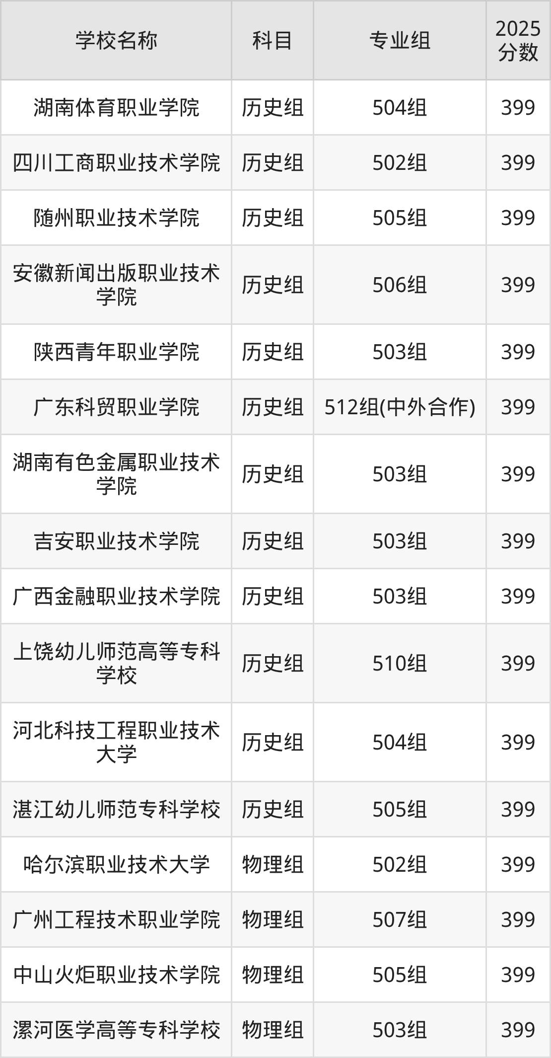 广东高考录取分数线在399分左右的公办院校专业组一共有18个,其中历史组有:湖南体育职业学院(399分)、四川工商职业技术学院(399分)、随州职业技术学院(399分),物理组有:哈尔滨职业技术大学(399分)、广州工程技术职业学院(399分)、中山火炬职业技术学院(399分)。