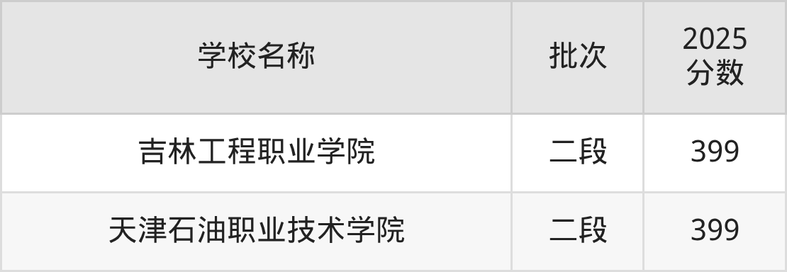 山东高考录取分数线在399分左右的公办大学一共有2所。分别是吉林工程职业学院(399分)、天津石油职业技术学院(399分)