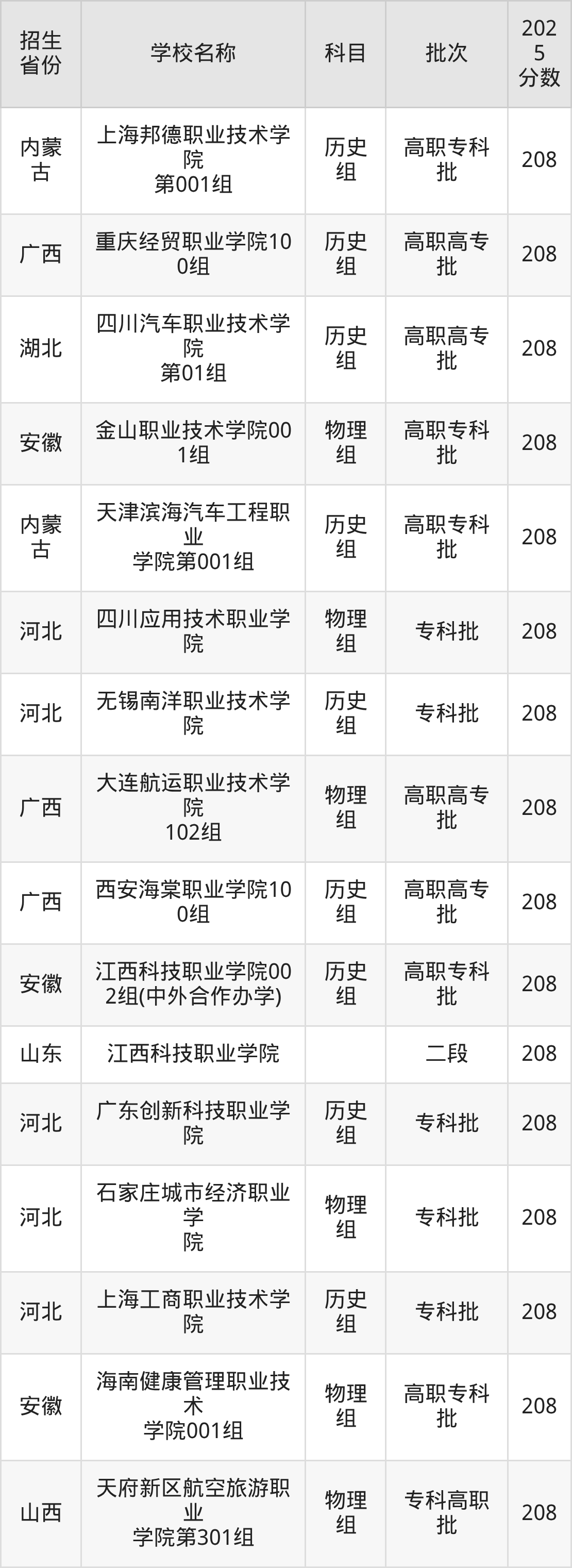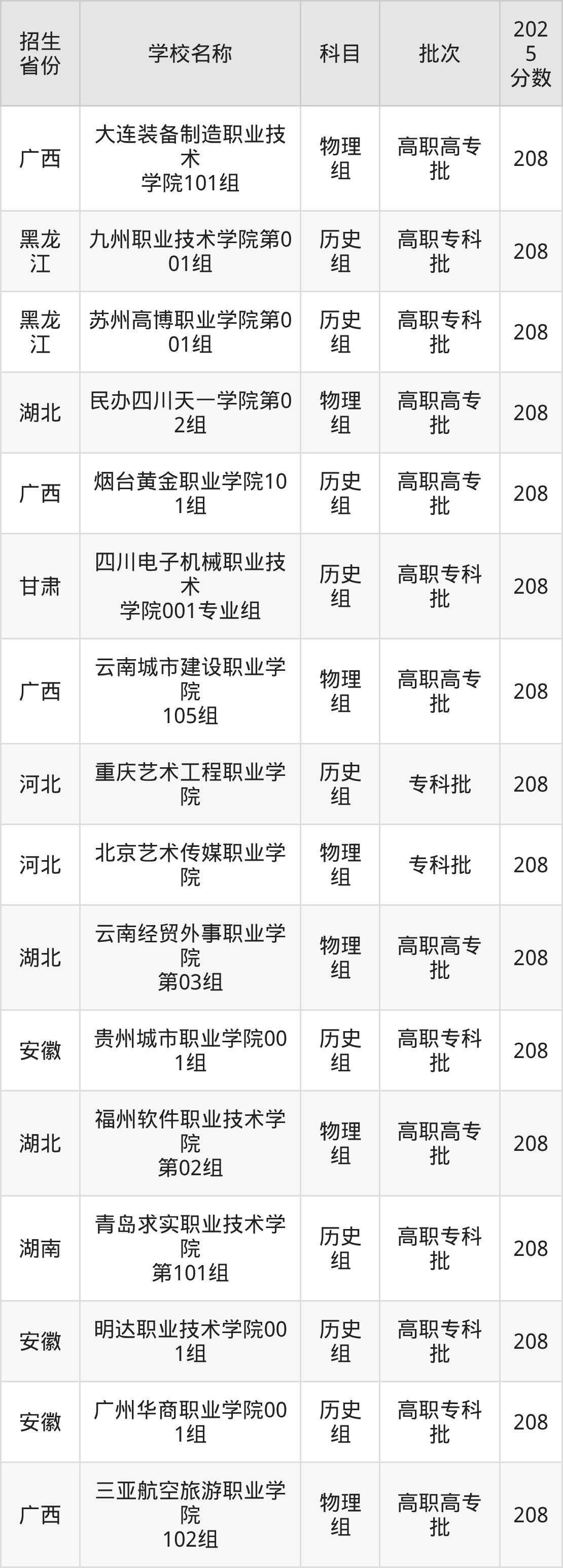 筛选全国各省2025年录取分数线为208分的民办专科学校如下: