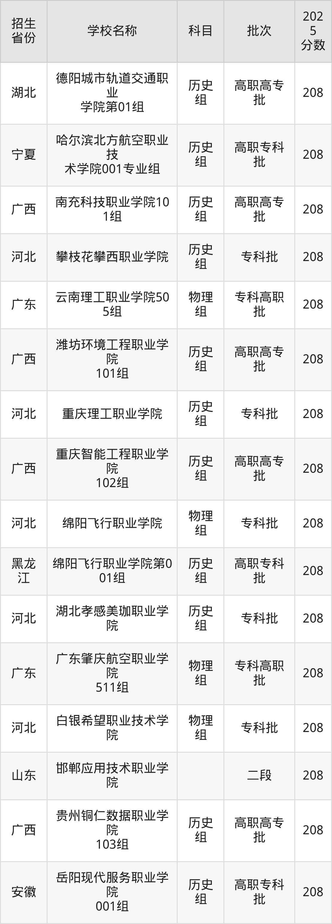 湖北省历史组分数线是208分的民办专科学校有:四川汽车职业技术学院、德阳城市轨道交通职业学院。