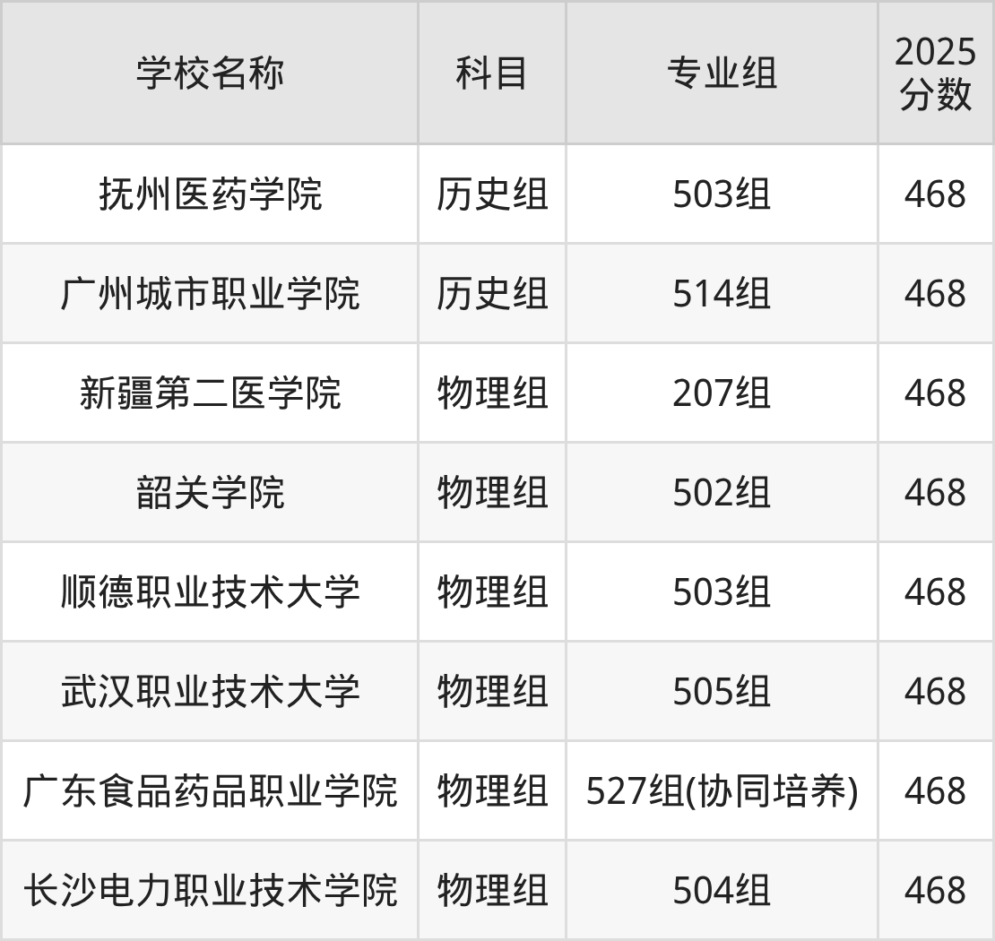 广东高考录取分数线在468分左右的公办院校专业组一共有8个,其中历史组有:抚州医药学院(468分)、广州城市职业学院(468分),物理组有:新疆第二医学院(468分)、韶关学院(468分)、顺德职业技术大学(468分)。