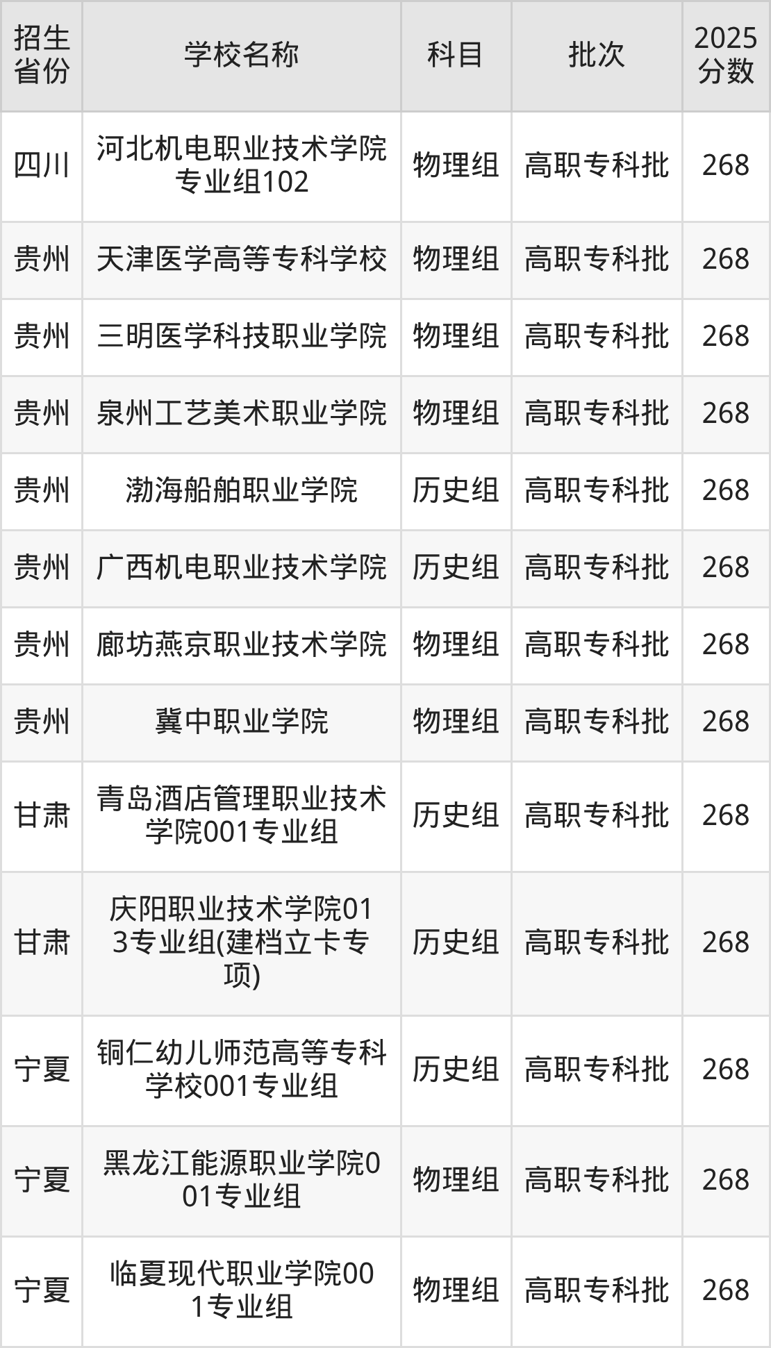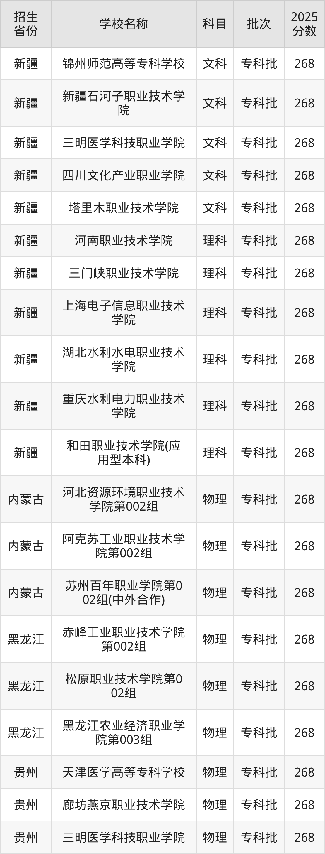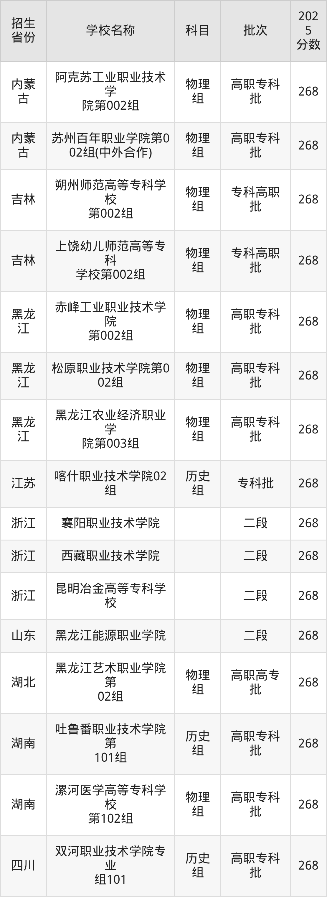 筛选全国各省2025年录取分数线为268分的公办专科大学如下: