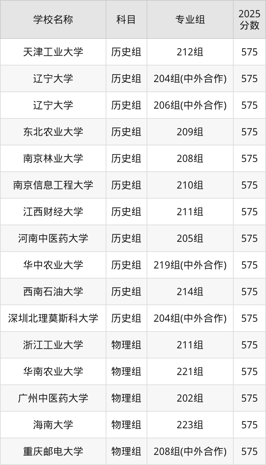 广东高考录取分数线在575分左右的公办院校专业组一共有21个,其中历史组有:天津工业大学(575分)、辽宁大学(575分)、东北农业大学(575分),物理组有:浙江工业大学(575分)、华南农业大学(575分)、广州中医药大学(575分)。