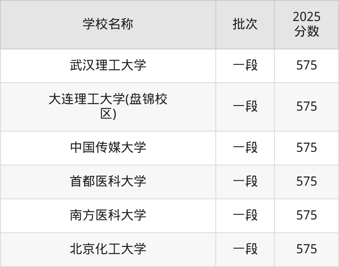 山东高考录取分数线在575分左右的公办大学一共有6所。分别是武汉理工大学(575分)、大连理工大学(盘锦校区)(575分)、中国传媒大学(575分)