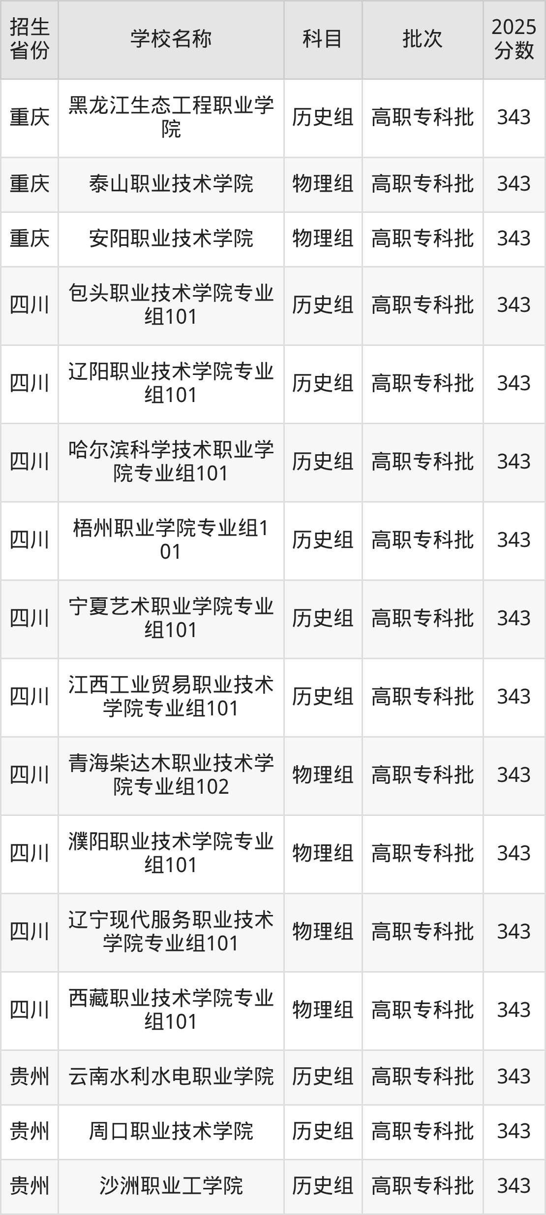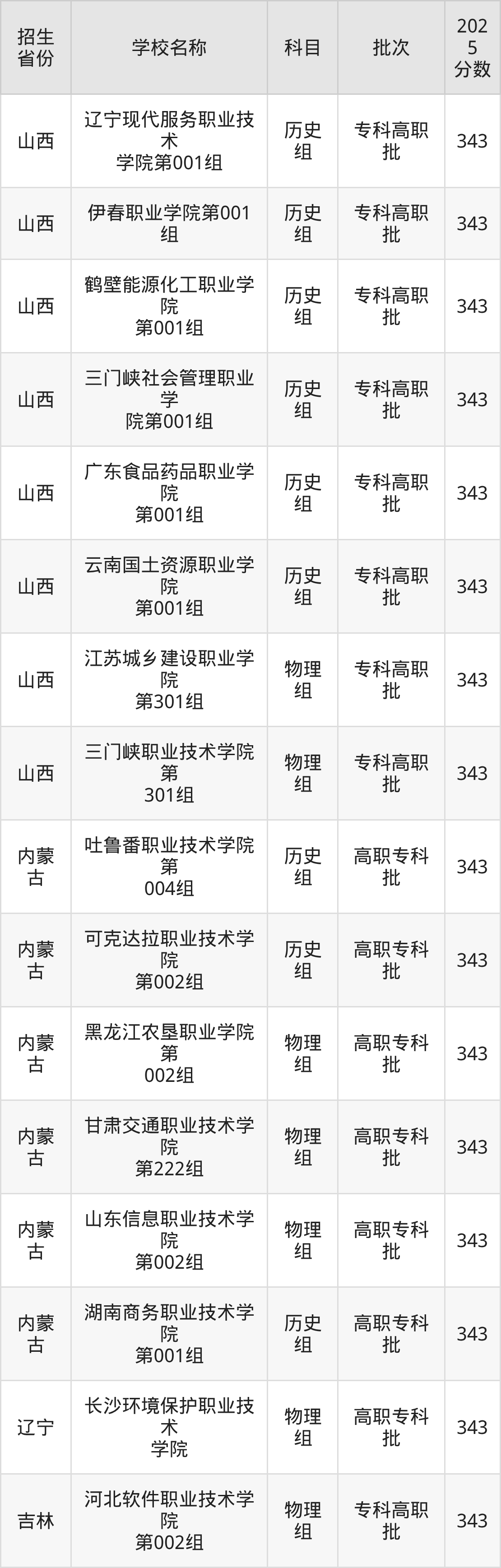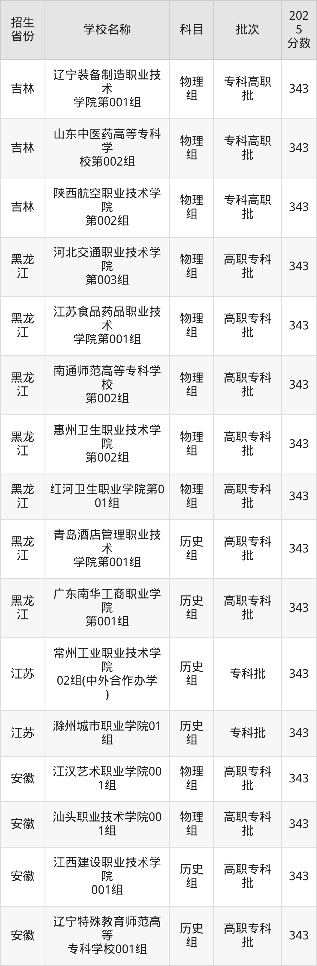 筛选全国各省2025年录取分数线为343分的公办专科大学如下:
