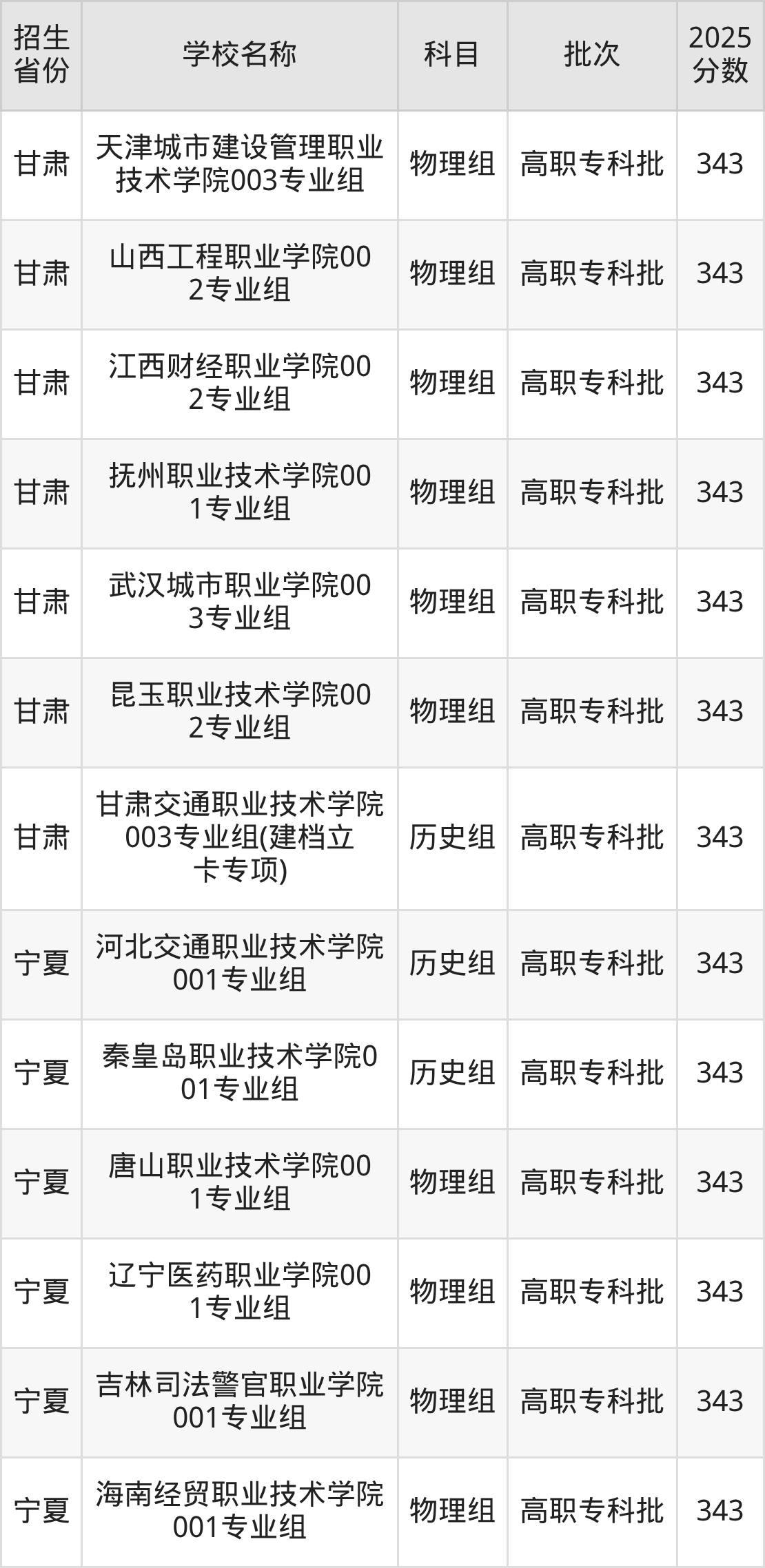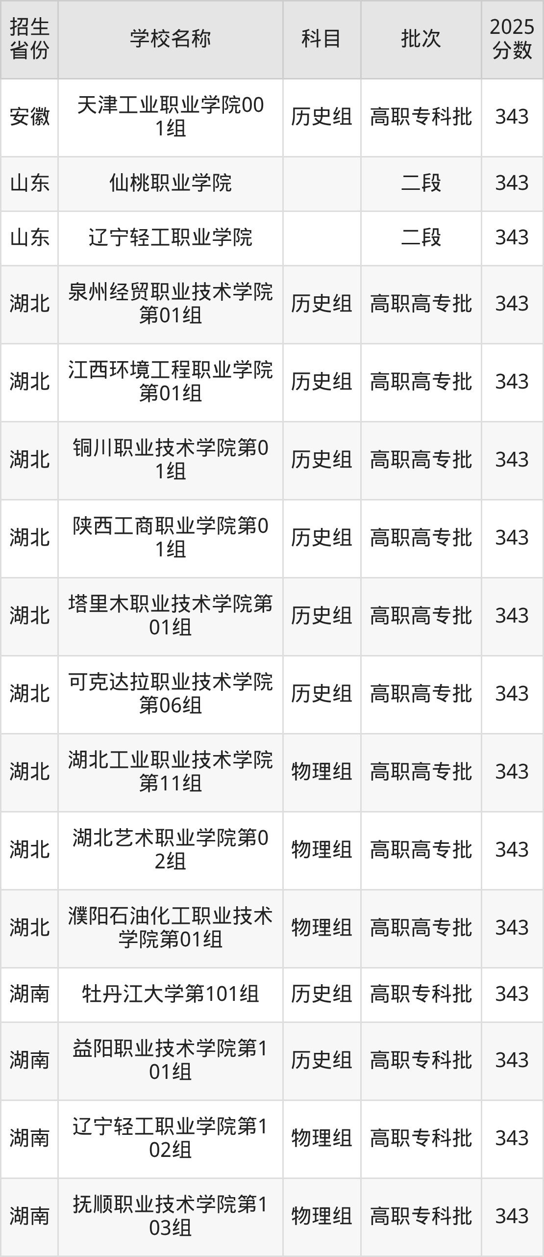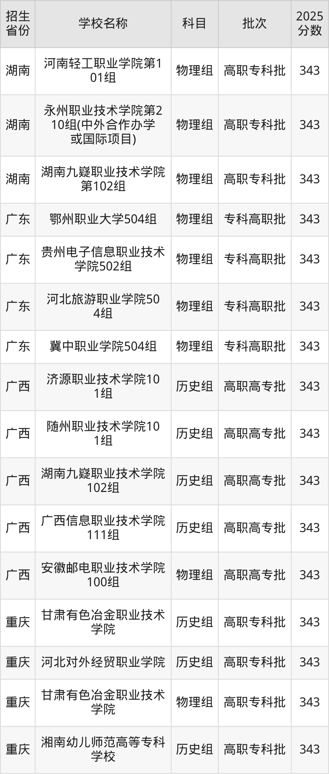筛选全国各省2025年录取分数线为343分的公办专科大学如下: