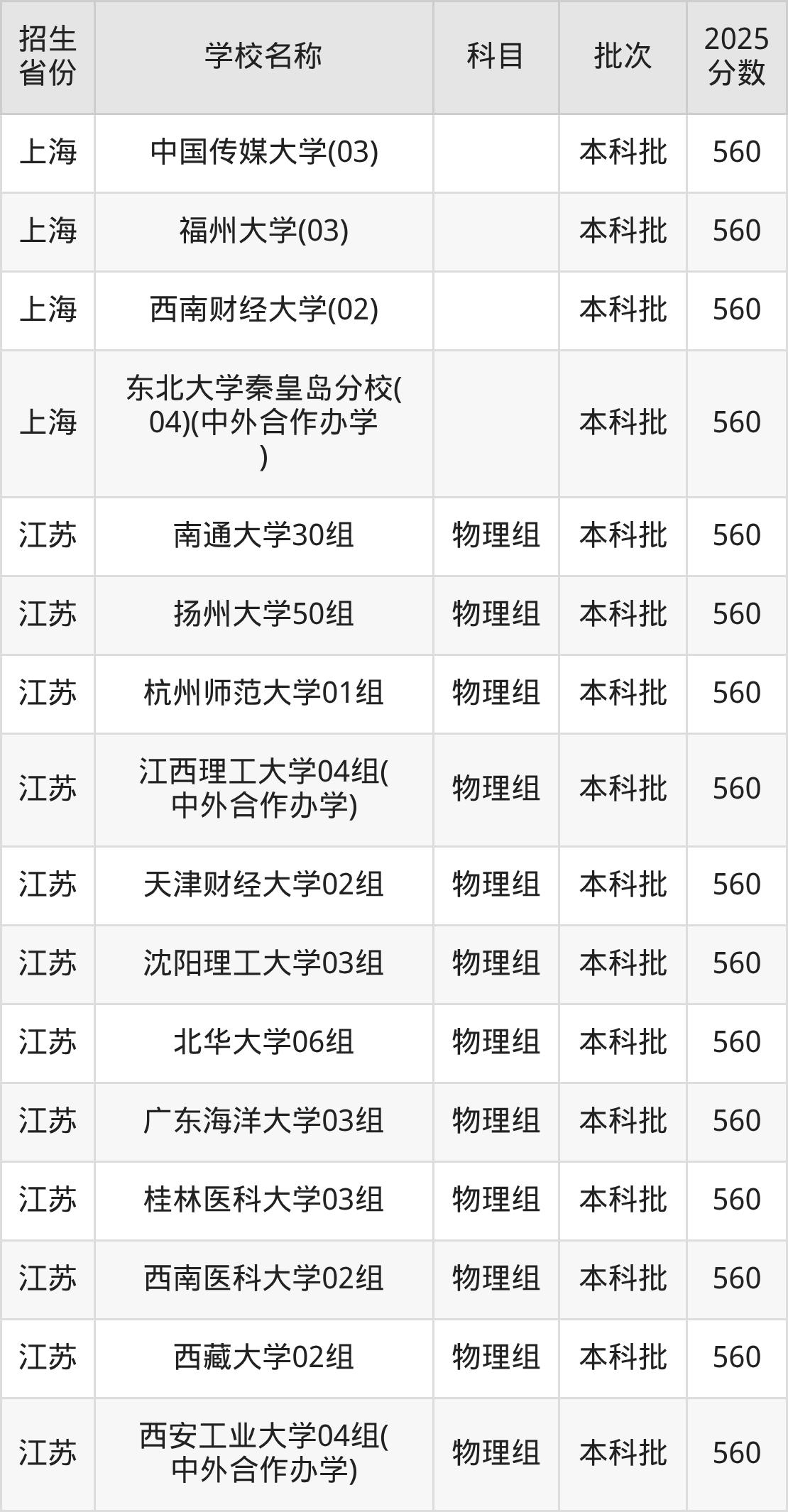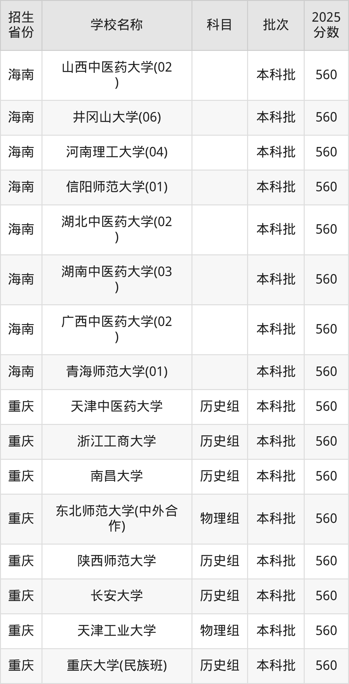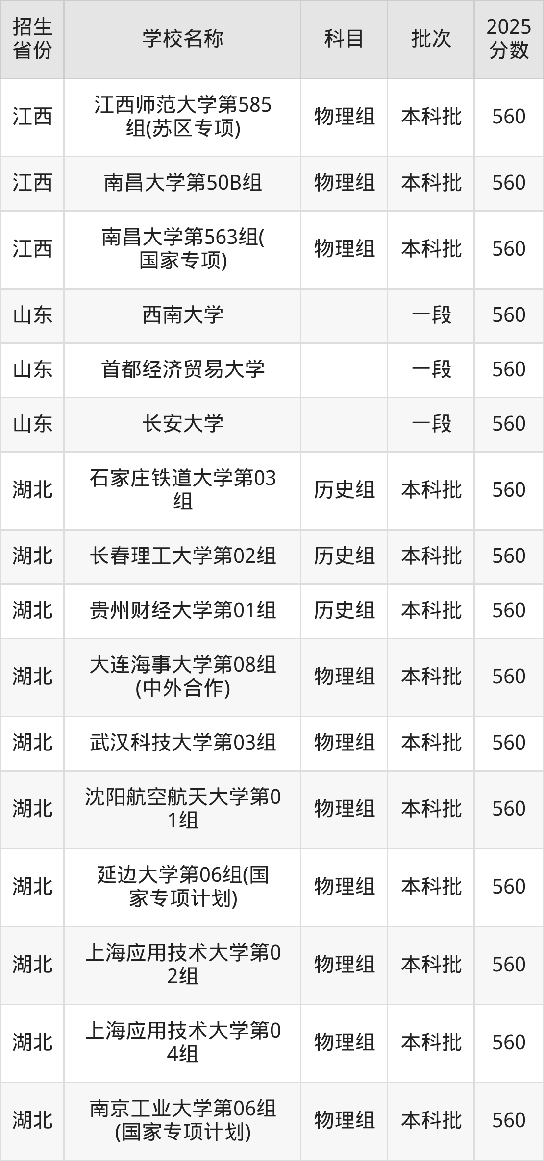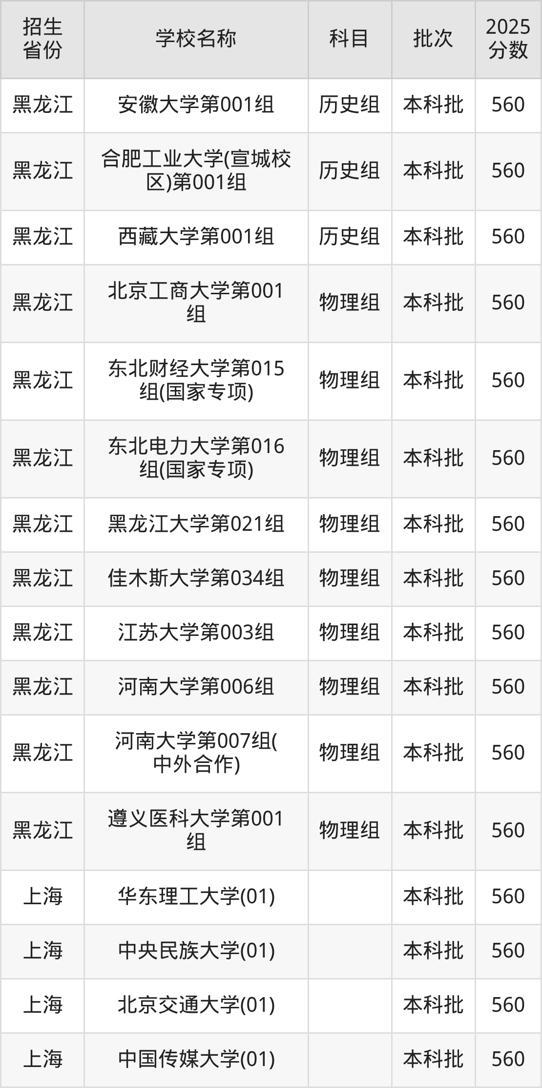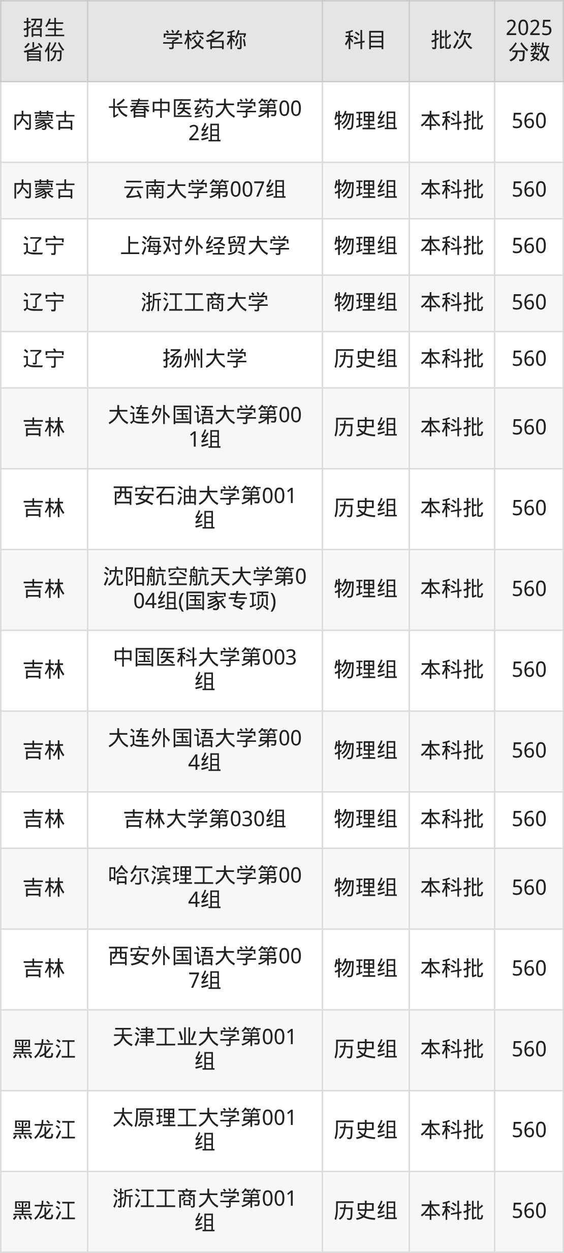 筛选全国各省2025年录取分数线为560分的一本大学如下: