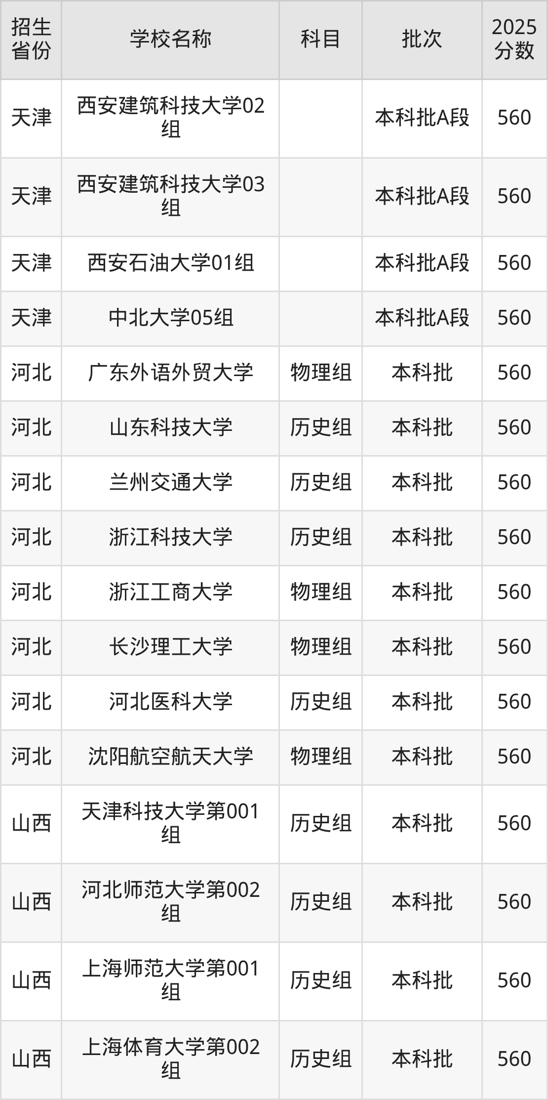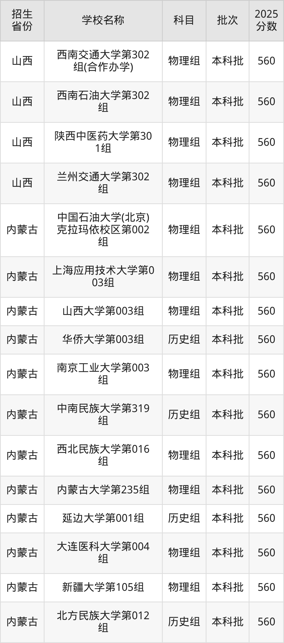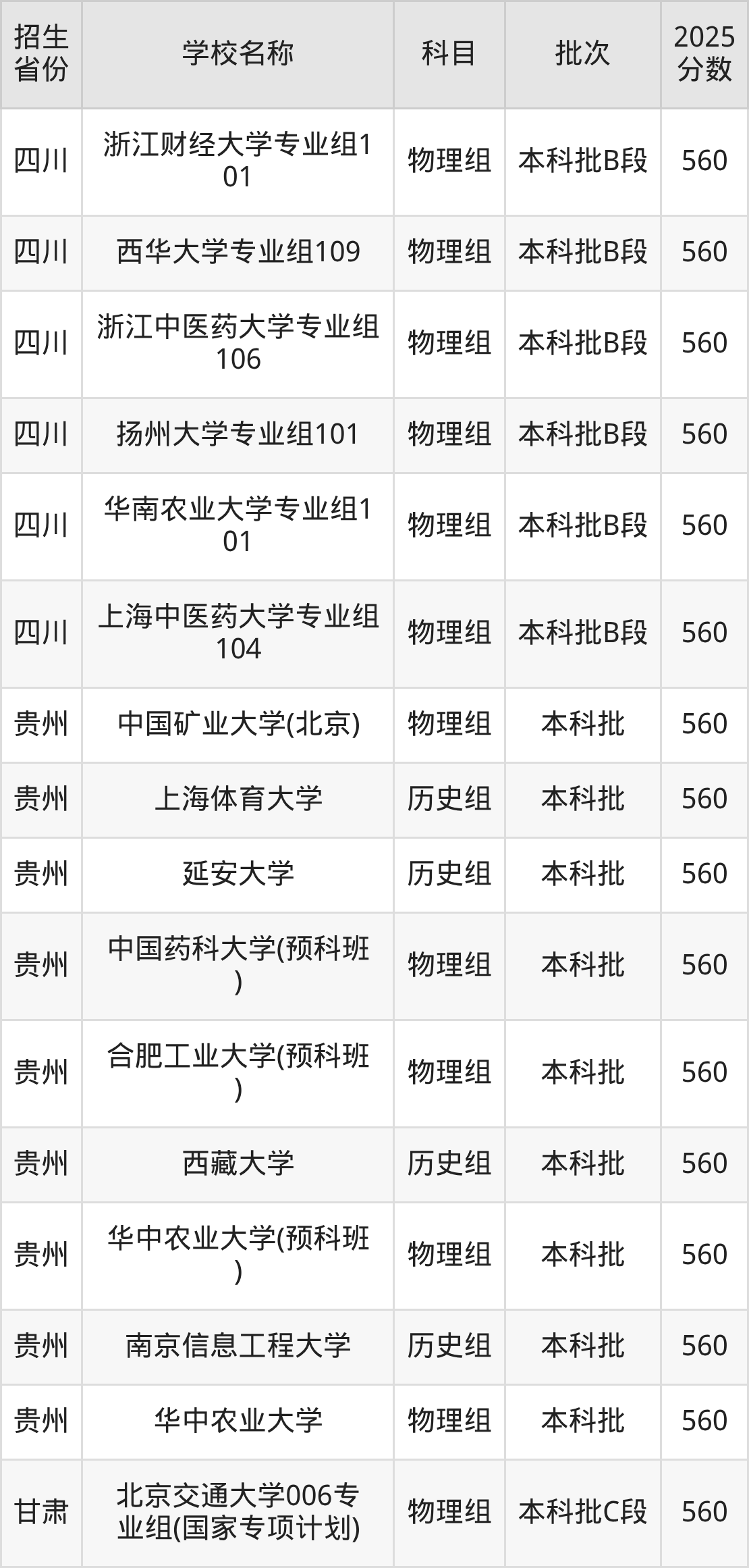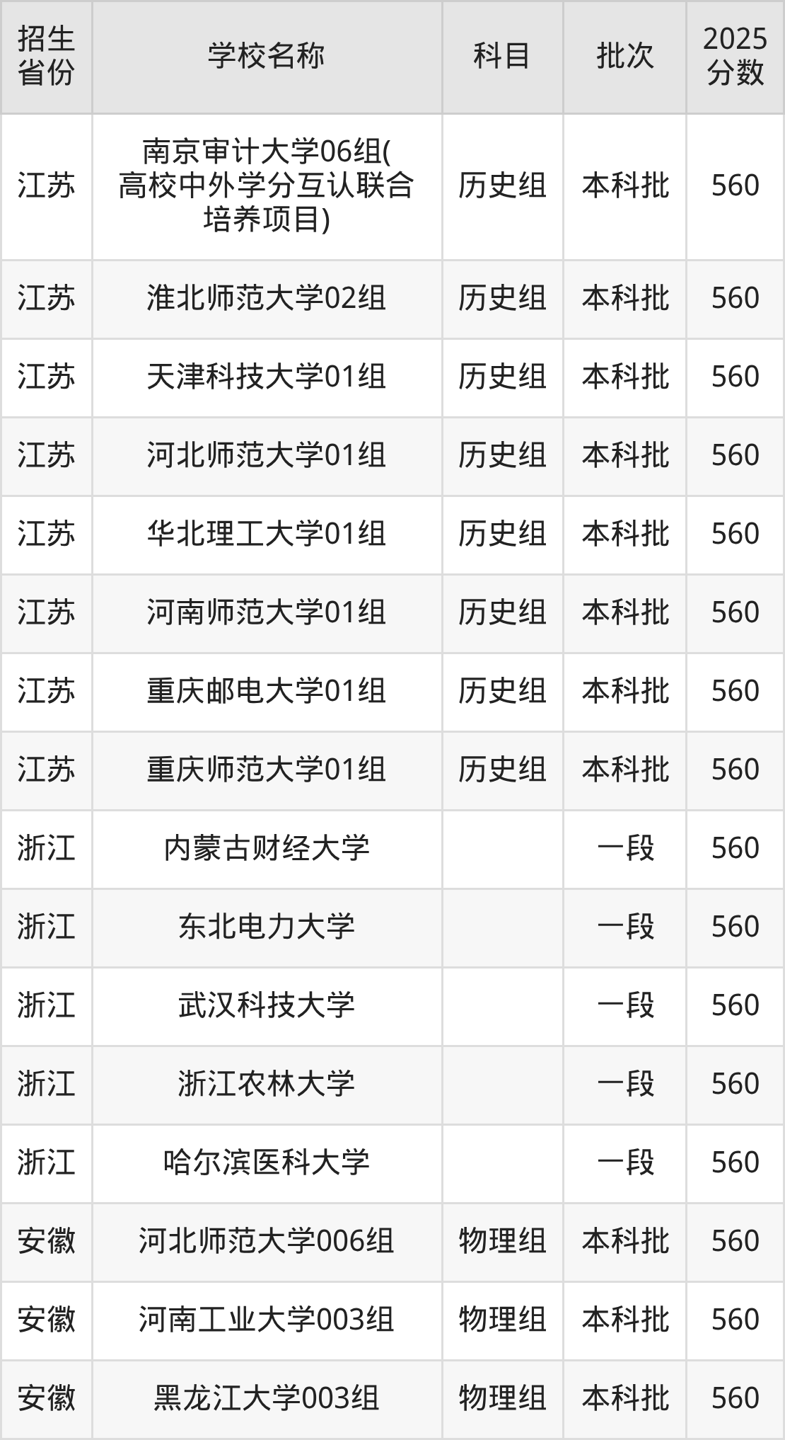 筛选全国各省2025年录取分数线为560分的一本大学如下: