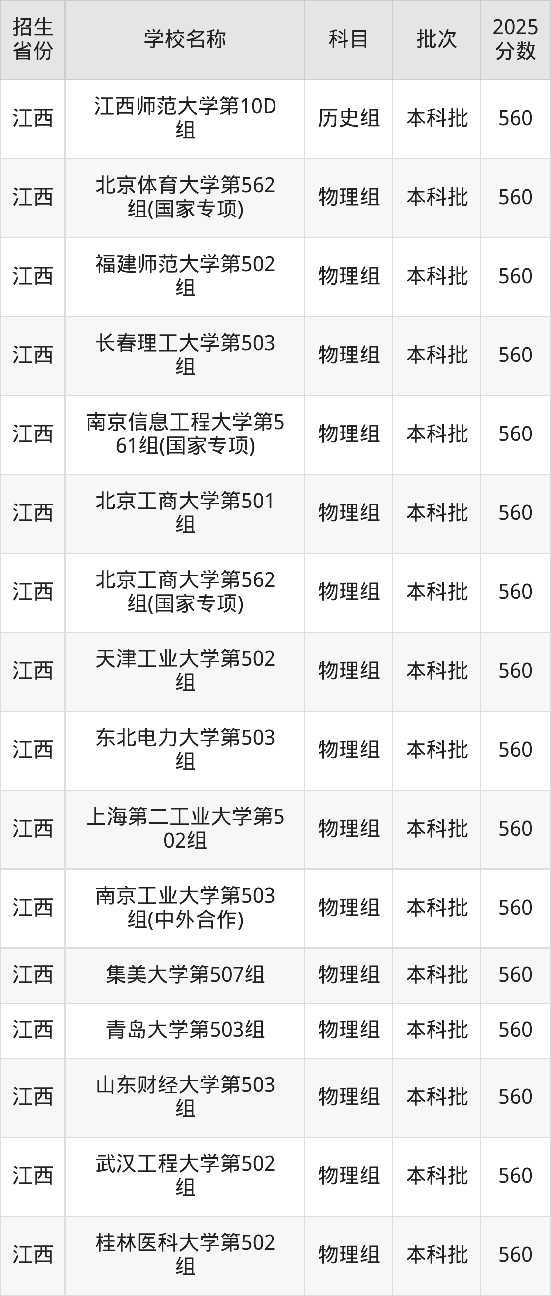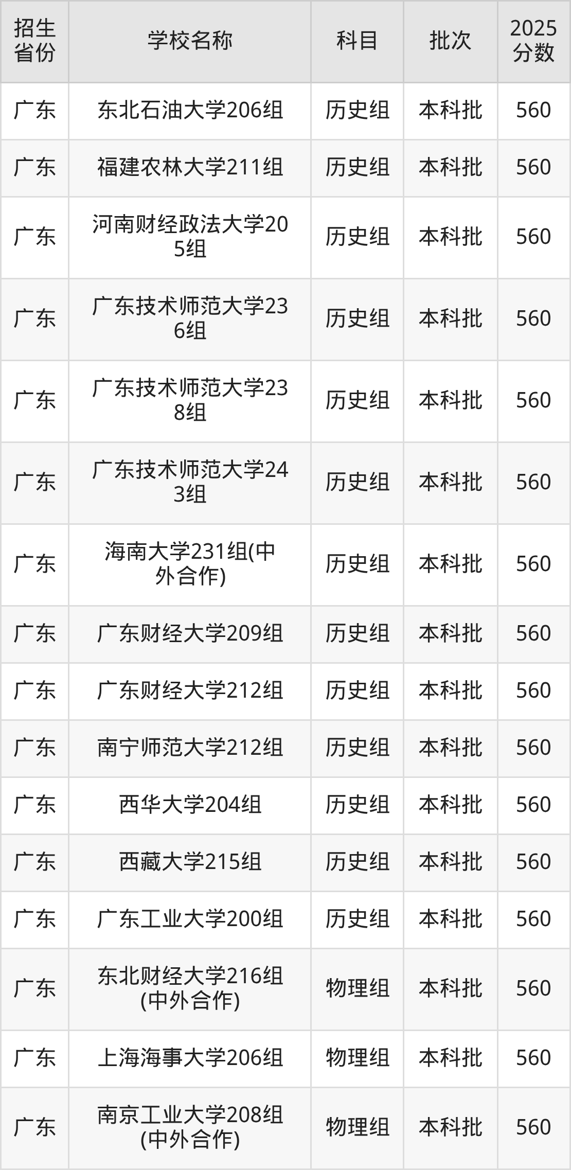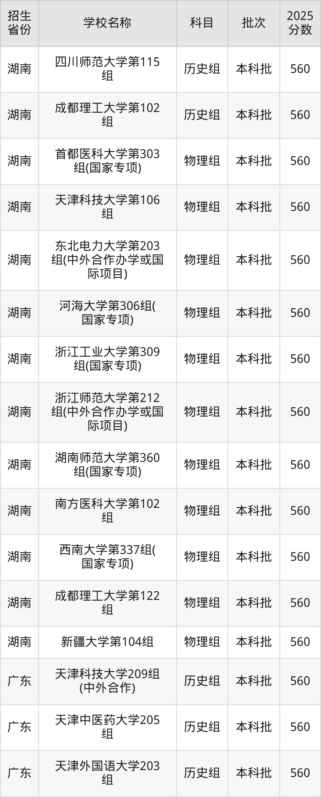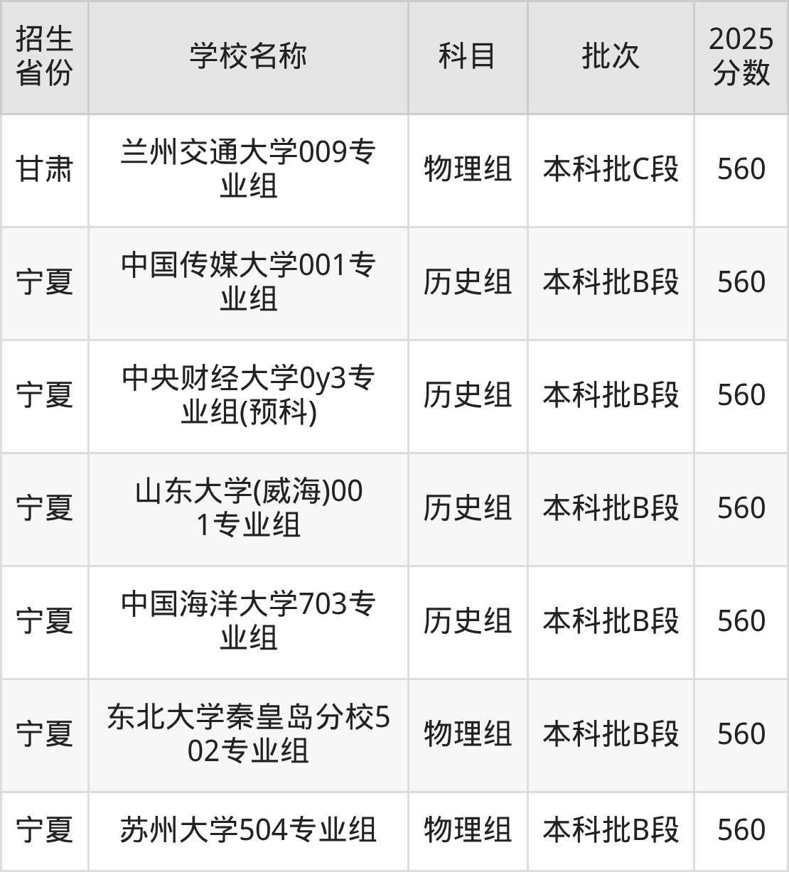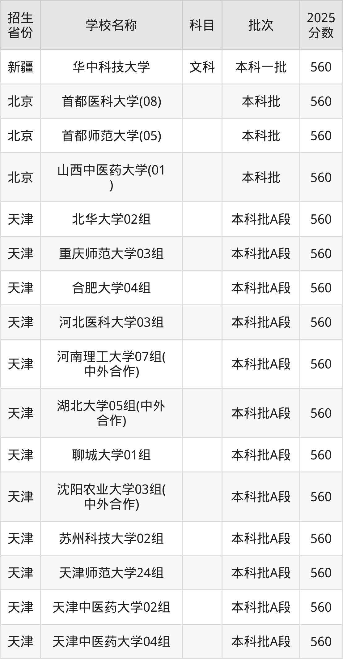 筛选全国各省2025年录取分数线为560分的一本大学如下: