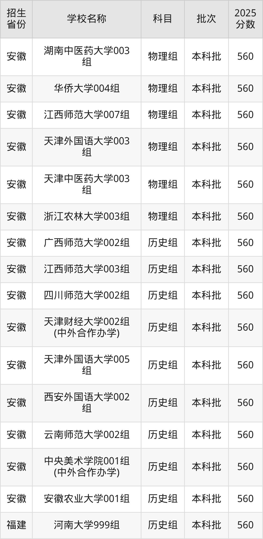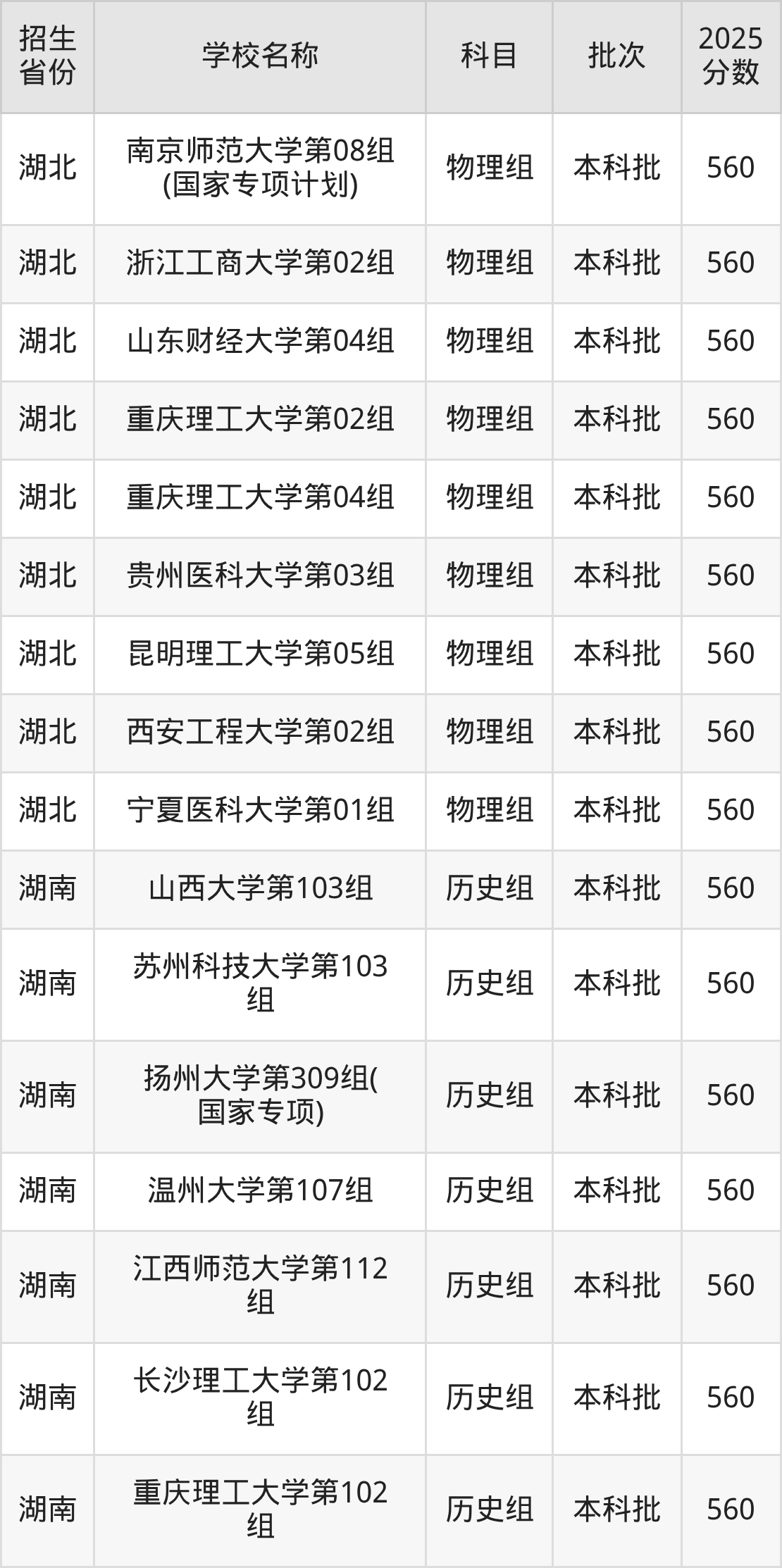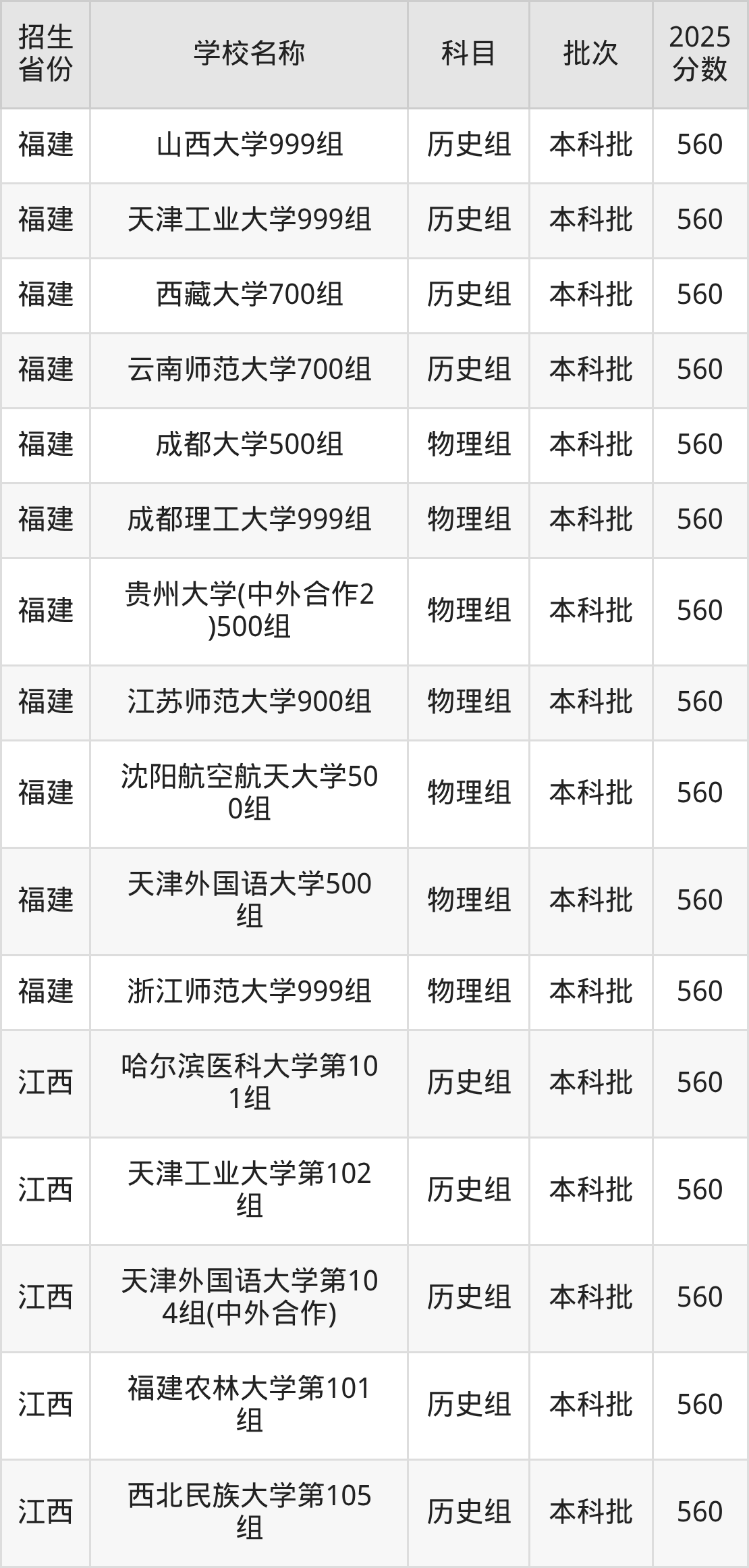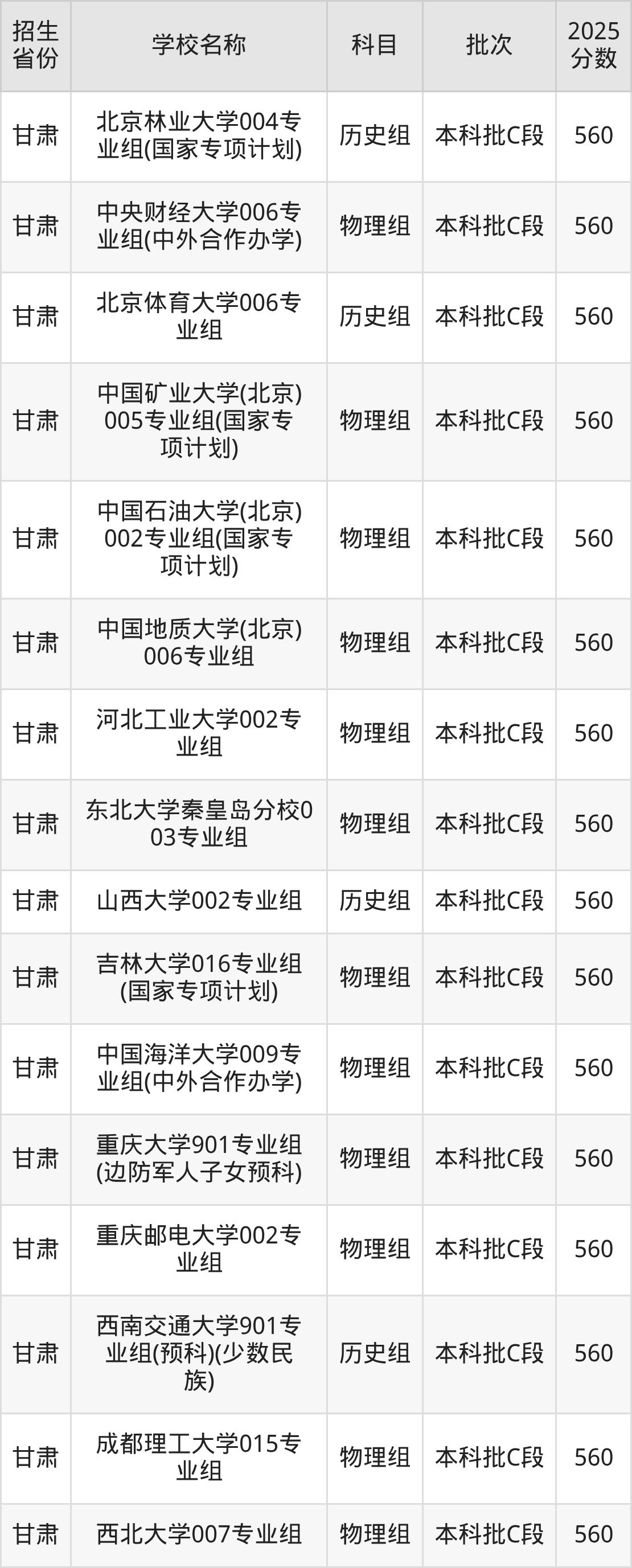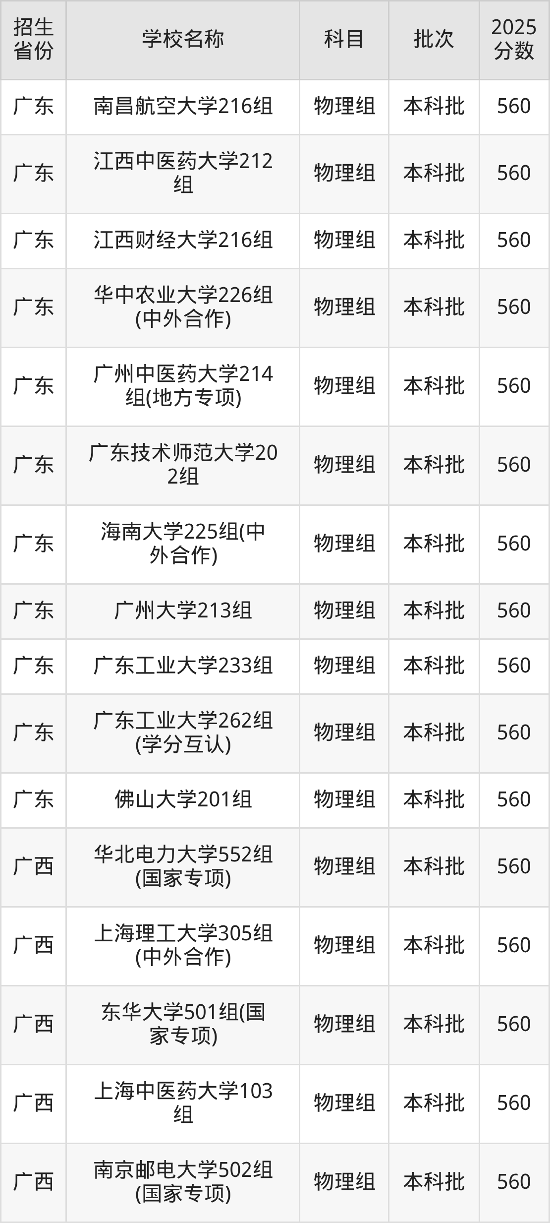 筛选全国各省2025年录取分数线为560分的一本大学如下: