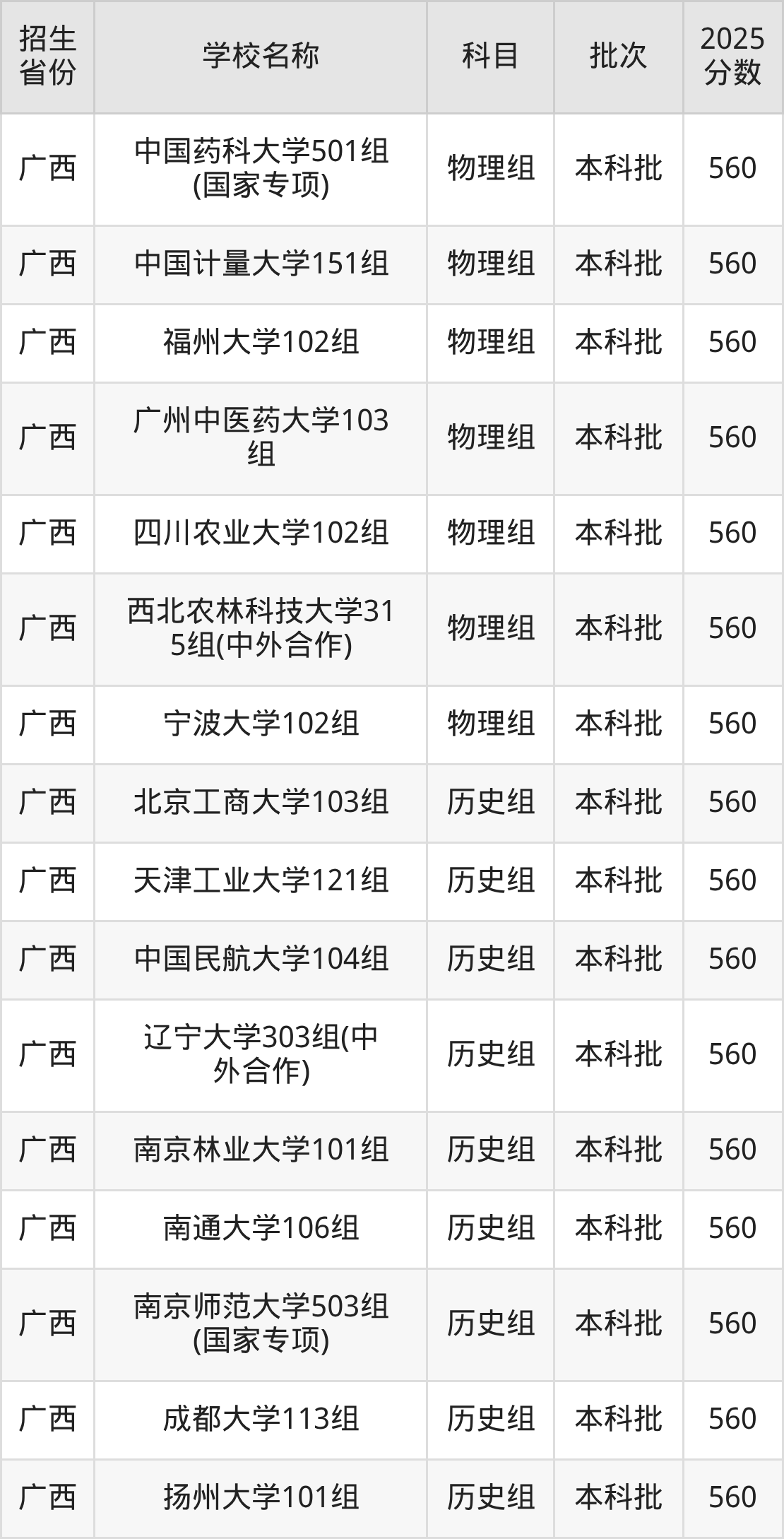 广西壮族自治区历史组分数线是560分的一本大学有:北京工商大学、天津工业大学、中国民航大学、辽宁大学、南京林业大学、南通大学、南京师范大学、成都大学、扬州大学。