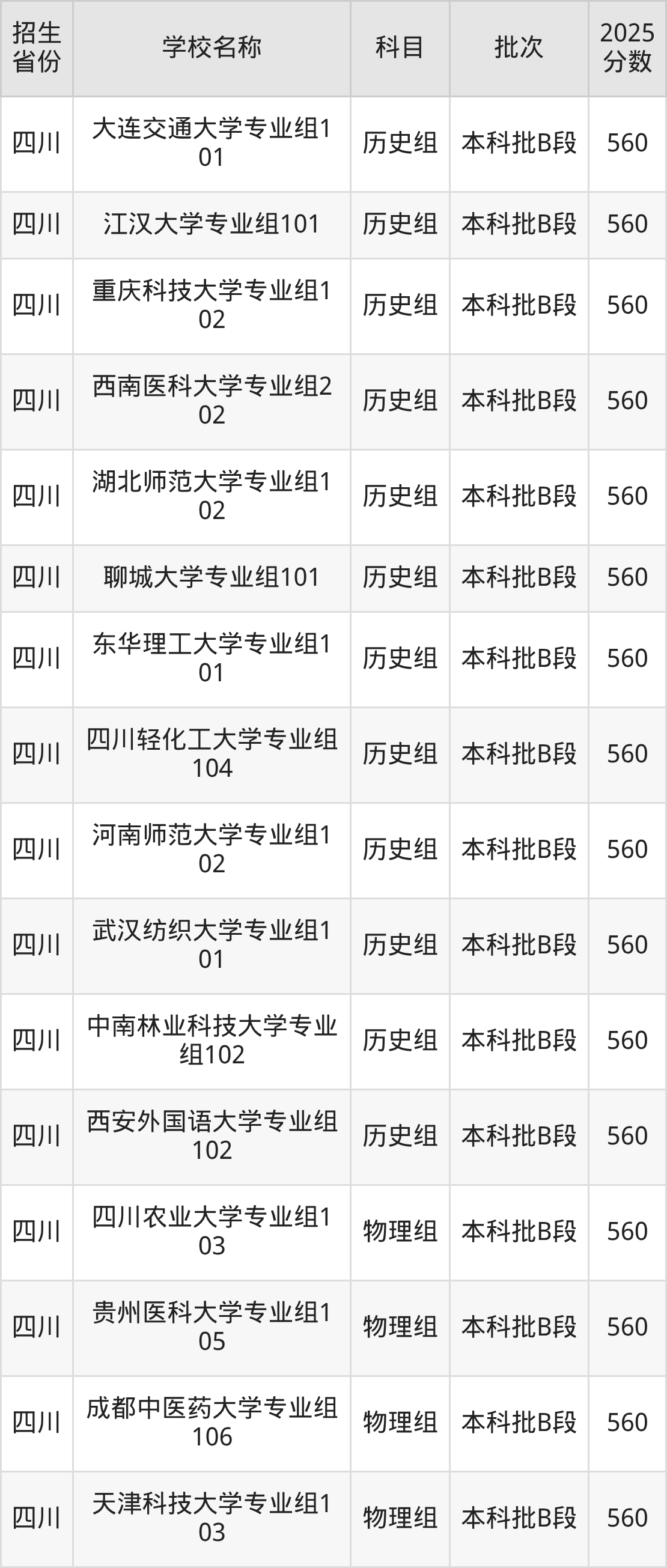 四川省历史组分数线是560分的一本大学有:大连交通大学、江汉大学、重庆科技大学、西南医科大学、湖北师范大学、聊城大学、东华理工大学、四川轻化工大学、河南师范大学、武汉纺织大学。