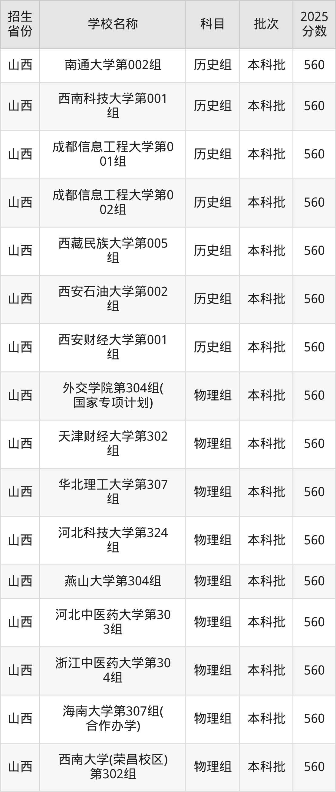 山西省历史组分数线是560分的一本大学有:天津科技大学、河北师范大学、上海师范大学、上海体育大学、南通大学、西南科技大学、成都信息工程大学、西藏民族大学、西安石油大学、西安财经大学。