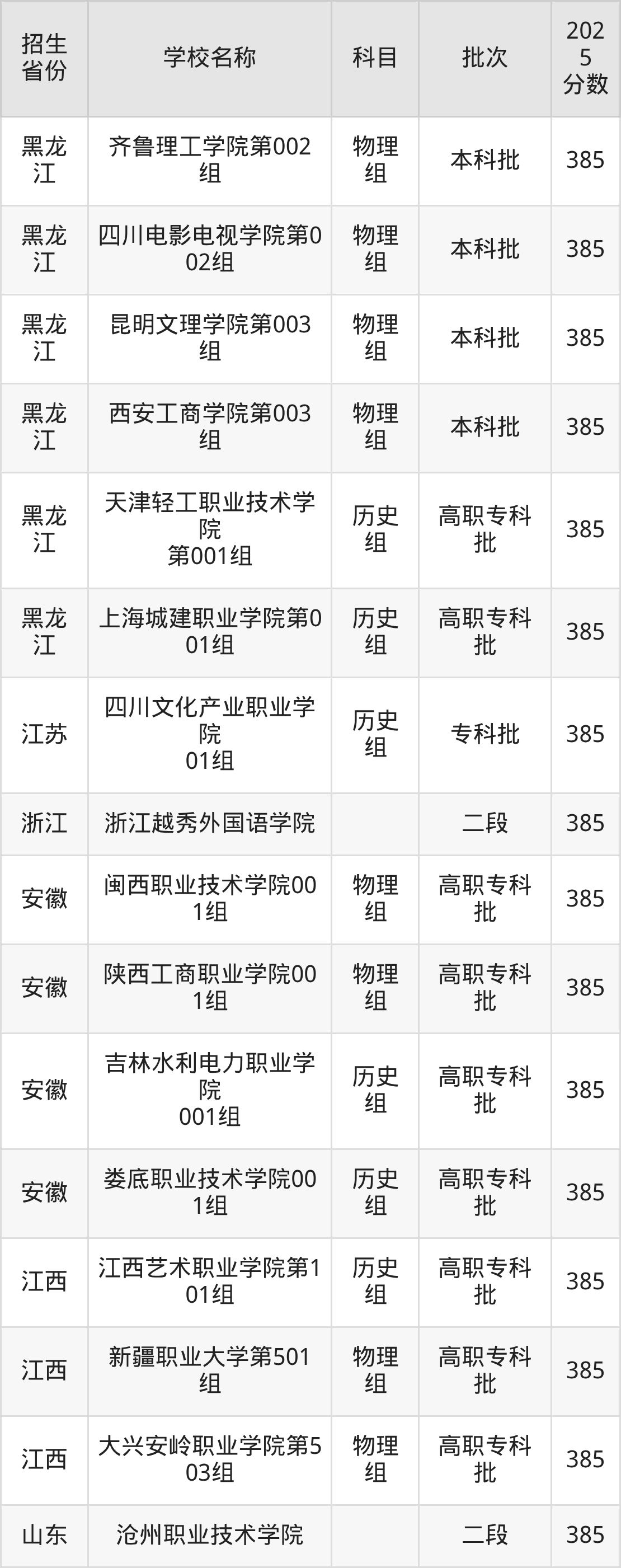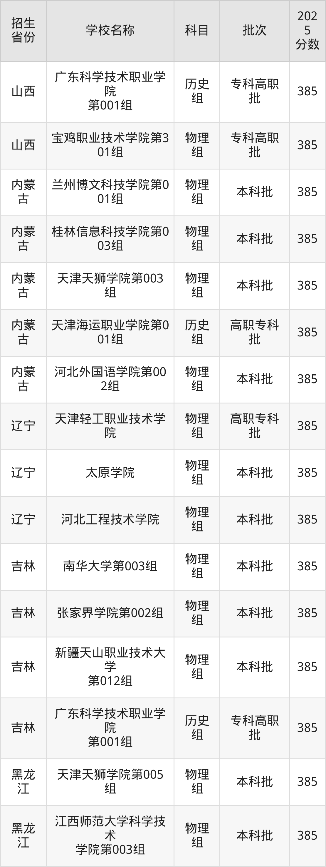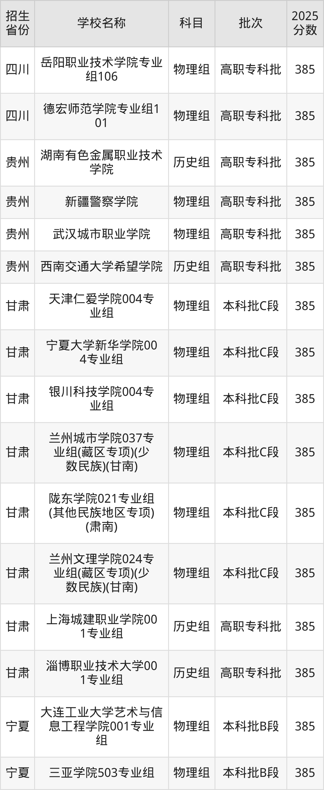 筛选全国各省2025年录取分数线为385分的文科大学如下: