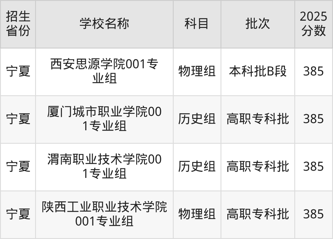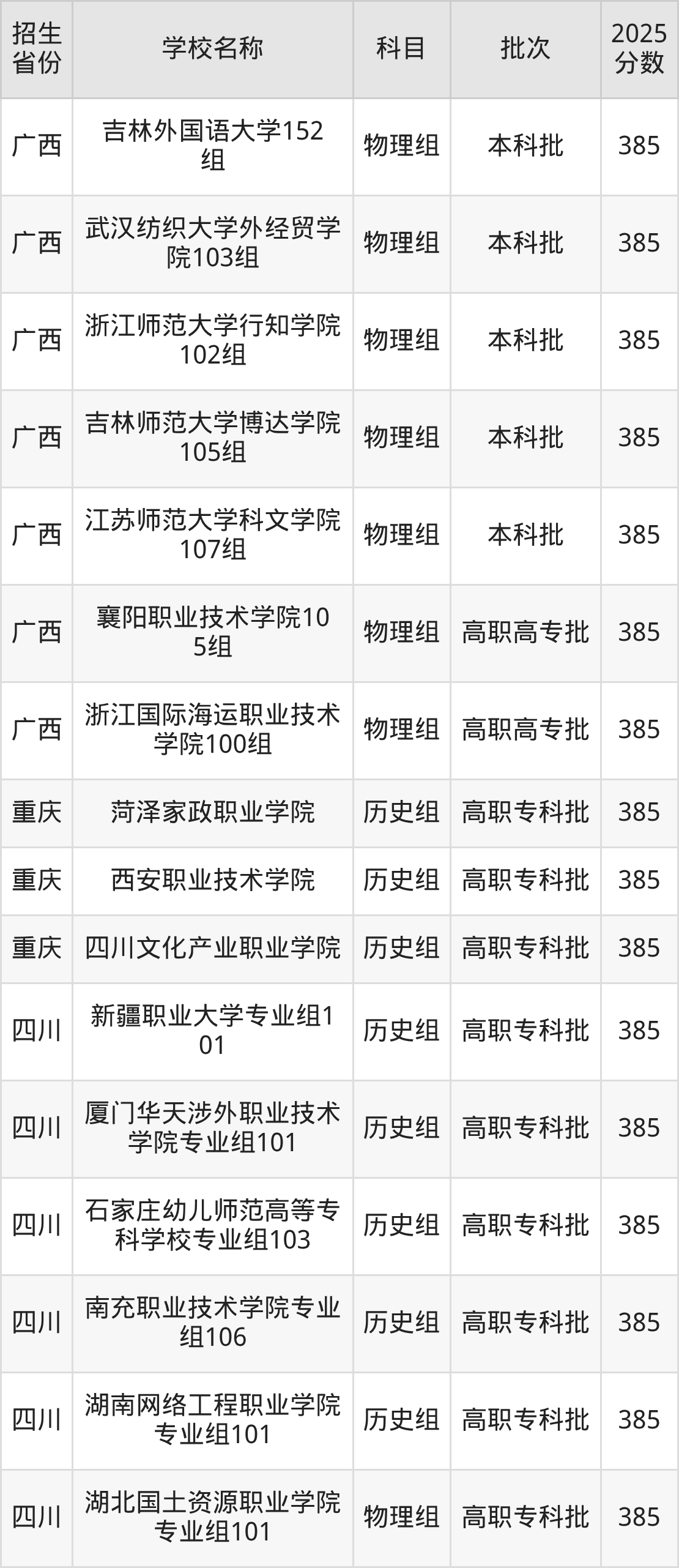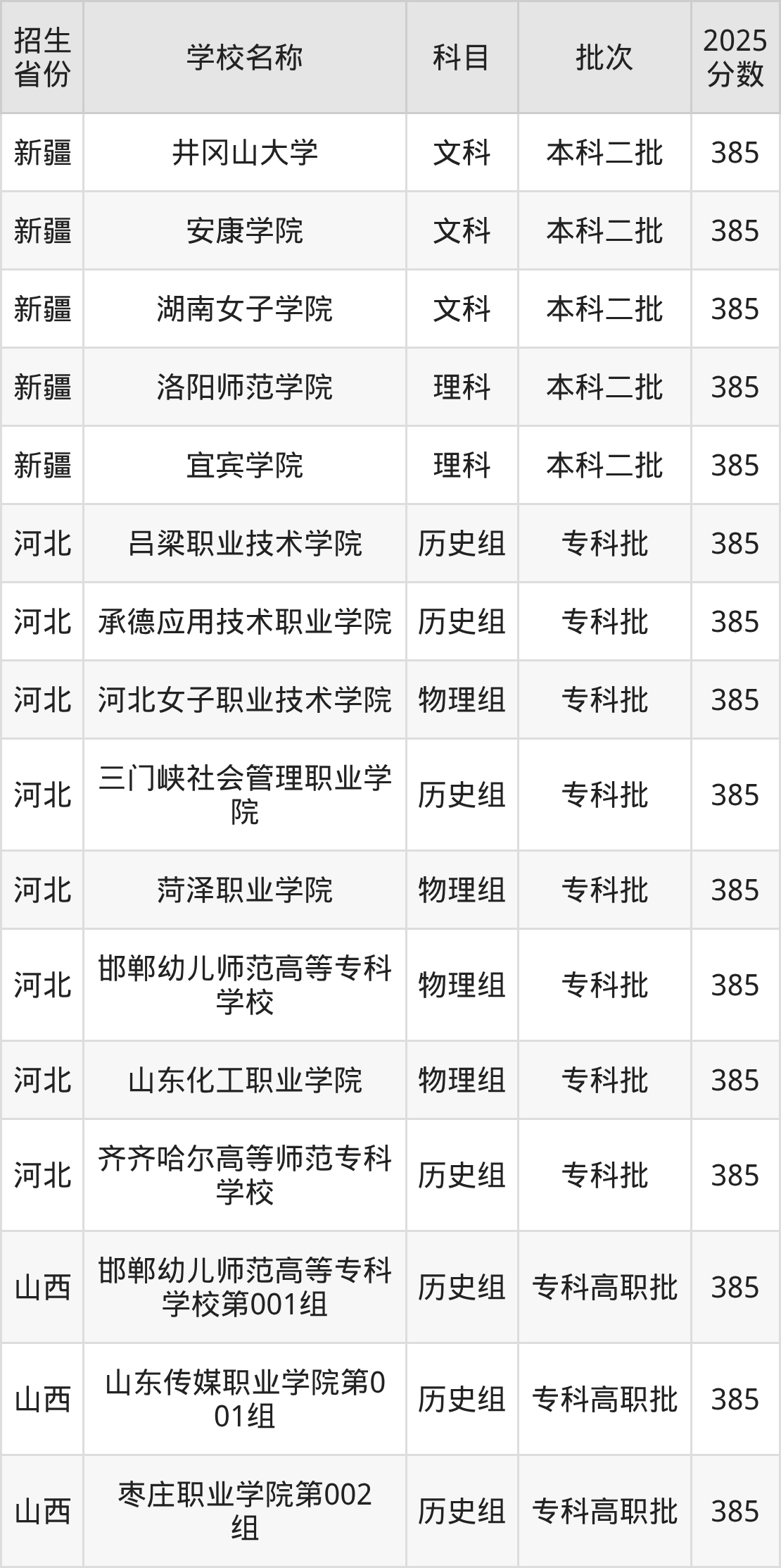 筛选全国各省2025年录取分数线为385分的文科大学如下: