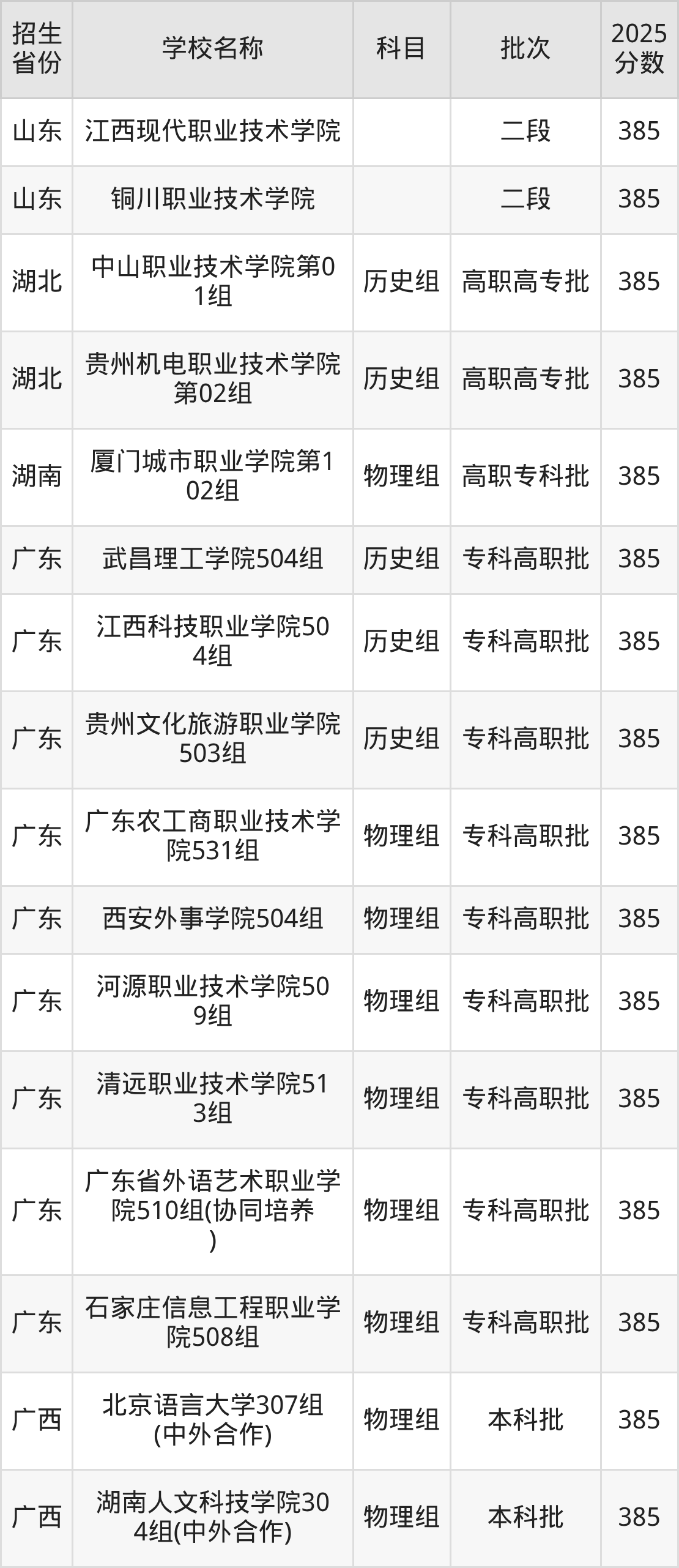 广东省历史组分数线是385分的文科大学有:武昌理工学院、江西科技职业学院、贵州文化旅游职业学院。