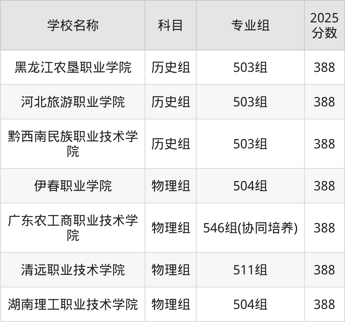 广东高考录取分数线在388分左右的公办院校专业组一共有7个,其中历史组有:黑龙江农垦职业学院(388分)、河北旅游职业学院(388分)、黔西南民族职业技术学院(388分),物理组有:伊春职业学院(388分)、广东农工商职业技术学院(388分)、清远职业技术学院(388分)。