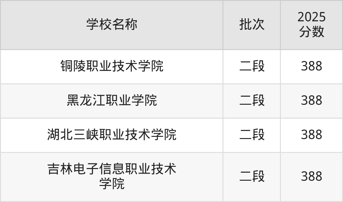 山东高考录取分数线在388分左右的公办大学一共有4所。分别是铜陵职业技术学院(388分)、黑龙江职业学院(388分)、湖北三峡职业技术学院(388分)