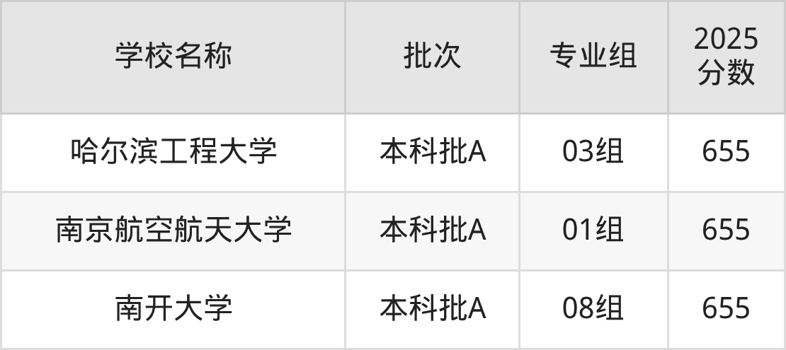 天津高考录取分数线在655分左右的公办大学一共有3所。分别是哈尔滨工程大学(655分)、南京航空航天大学(655分)、南开大学(655分)