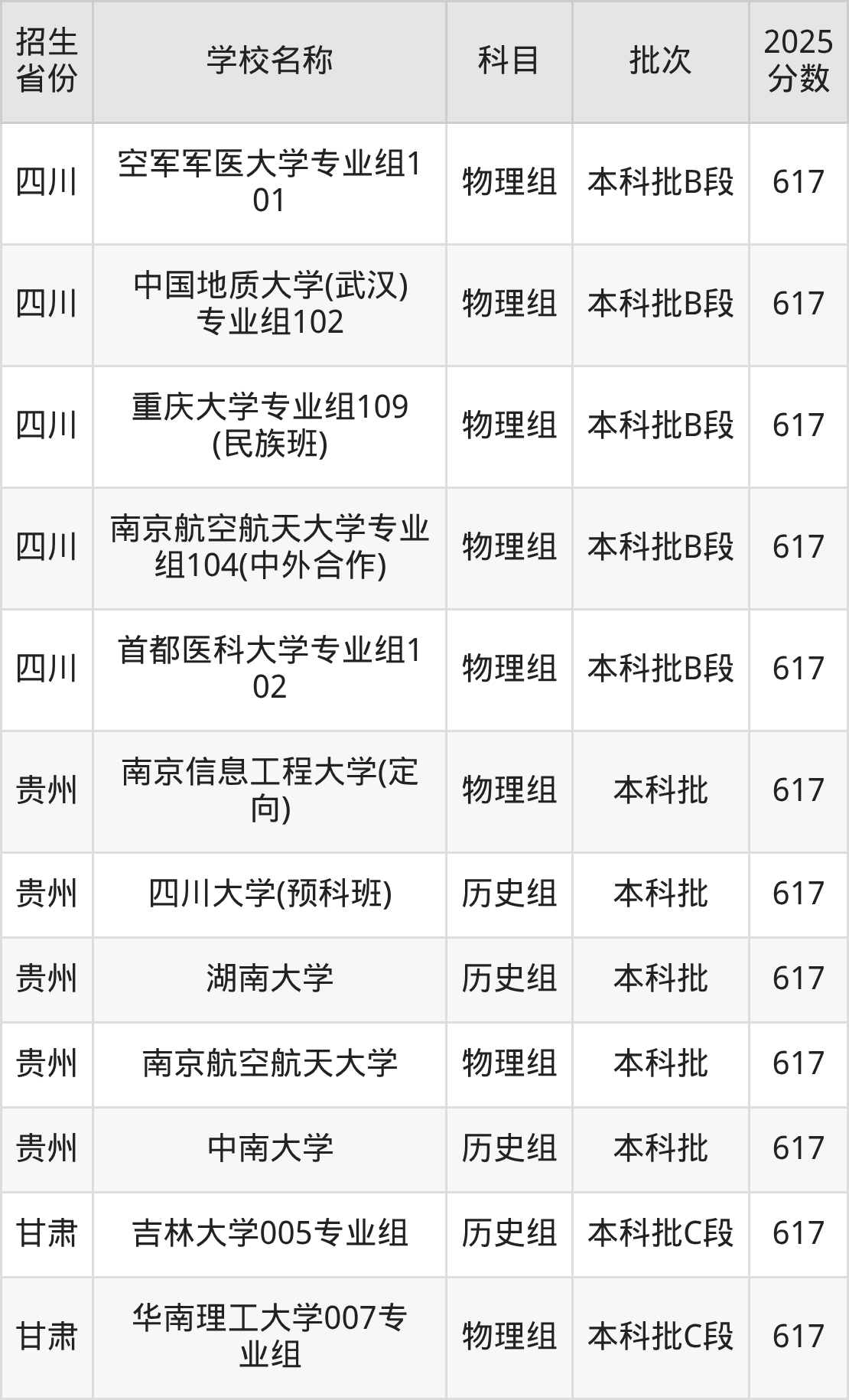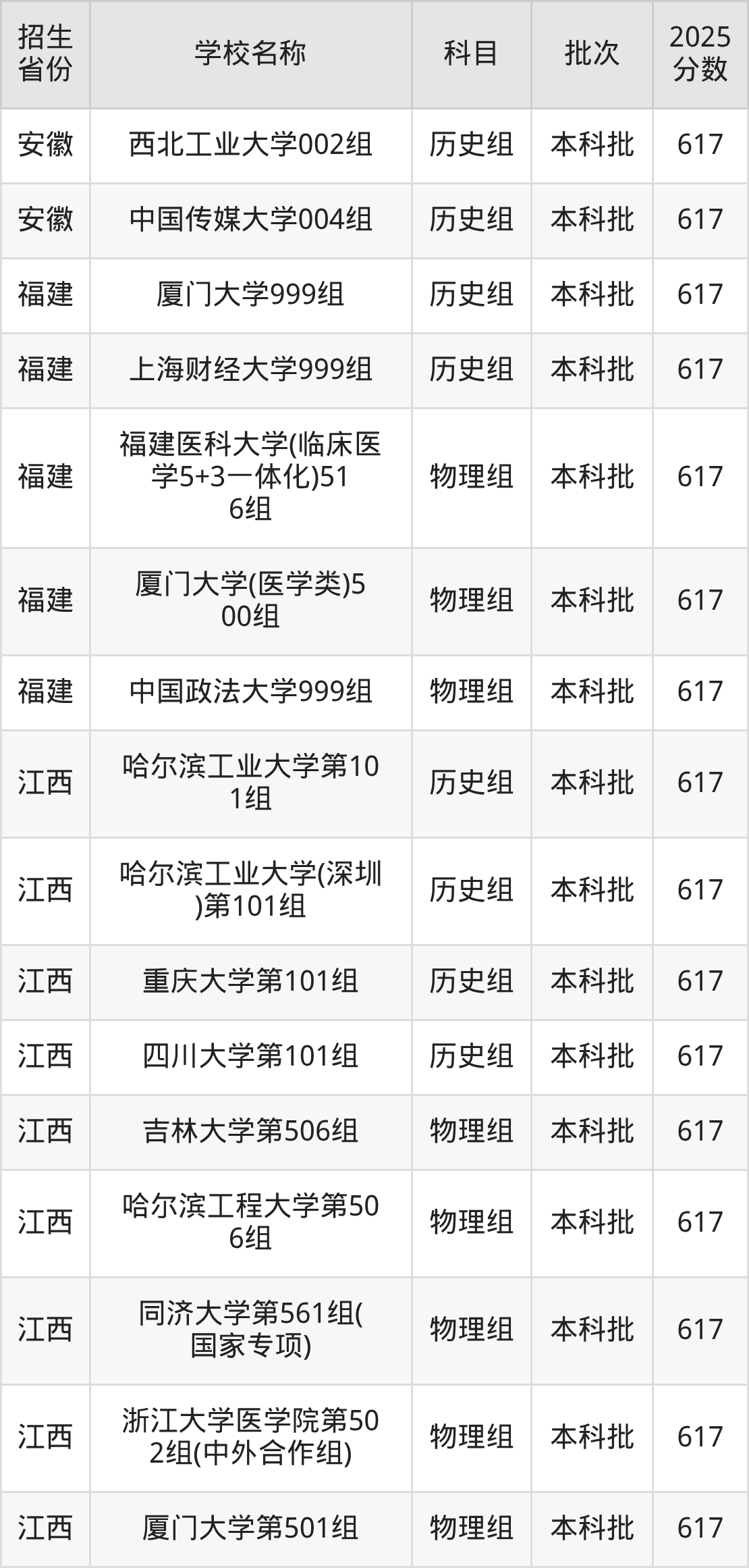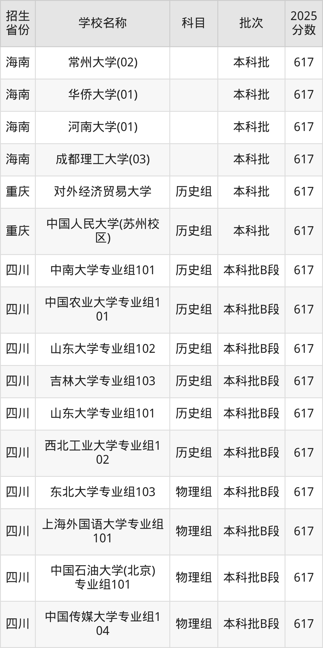 二、各省617分的重点大学名单