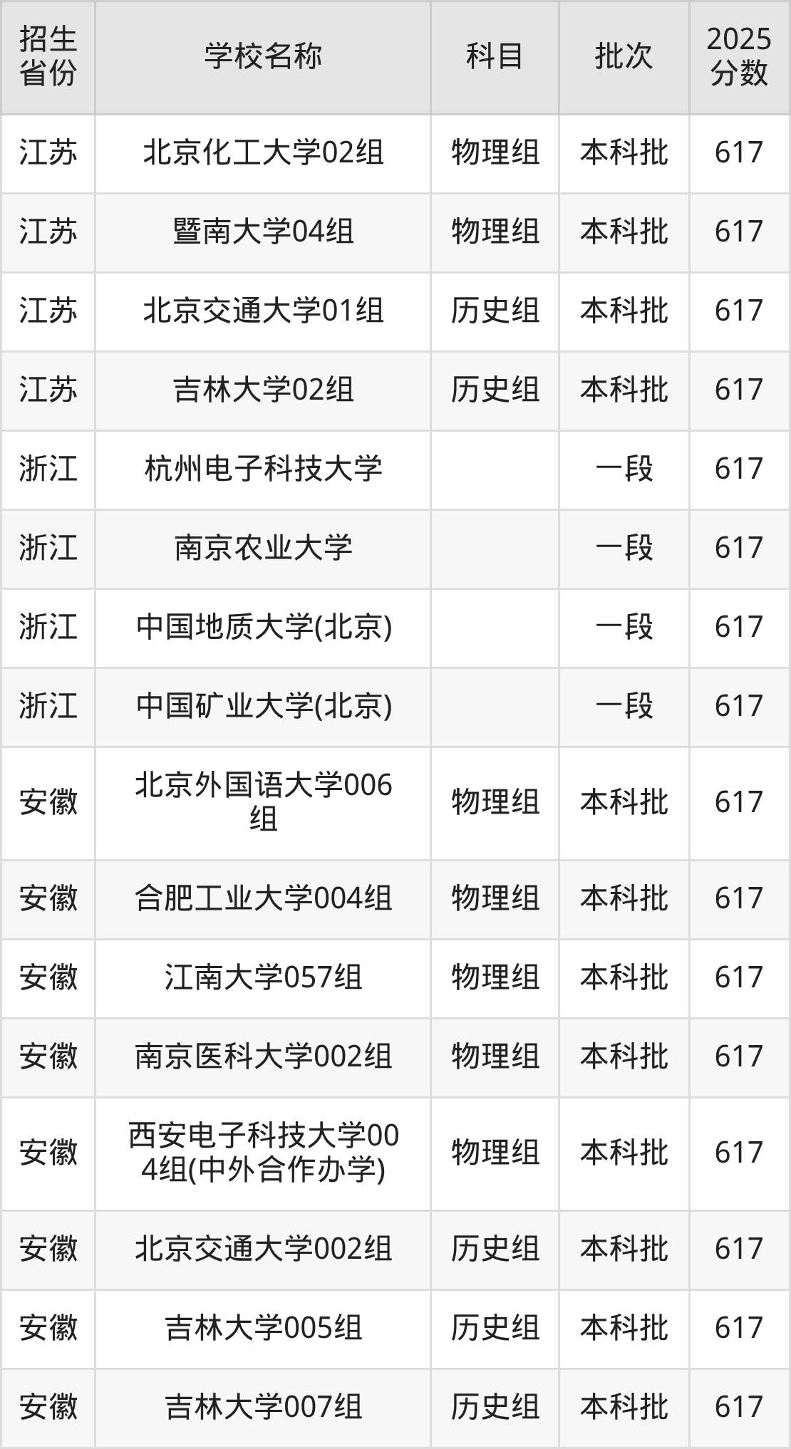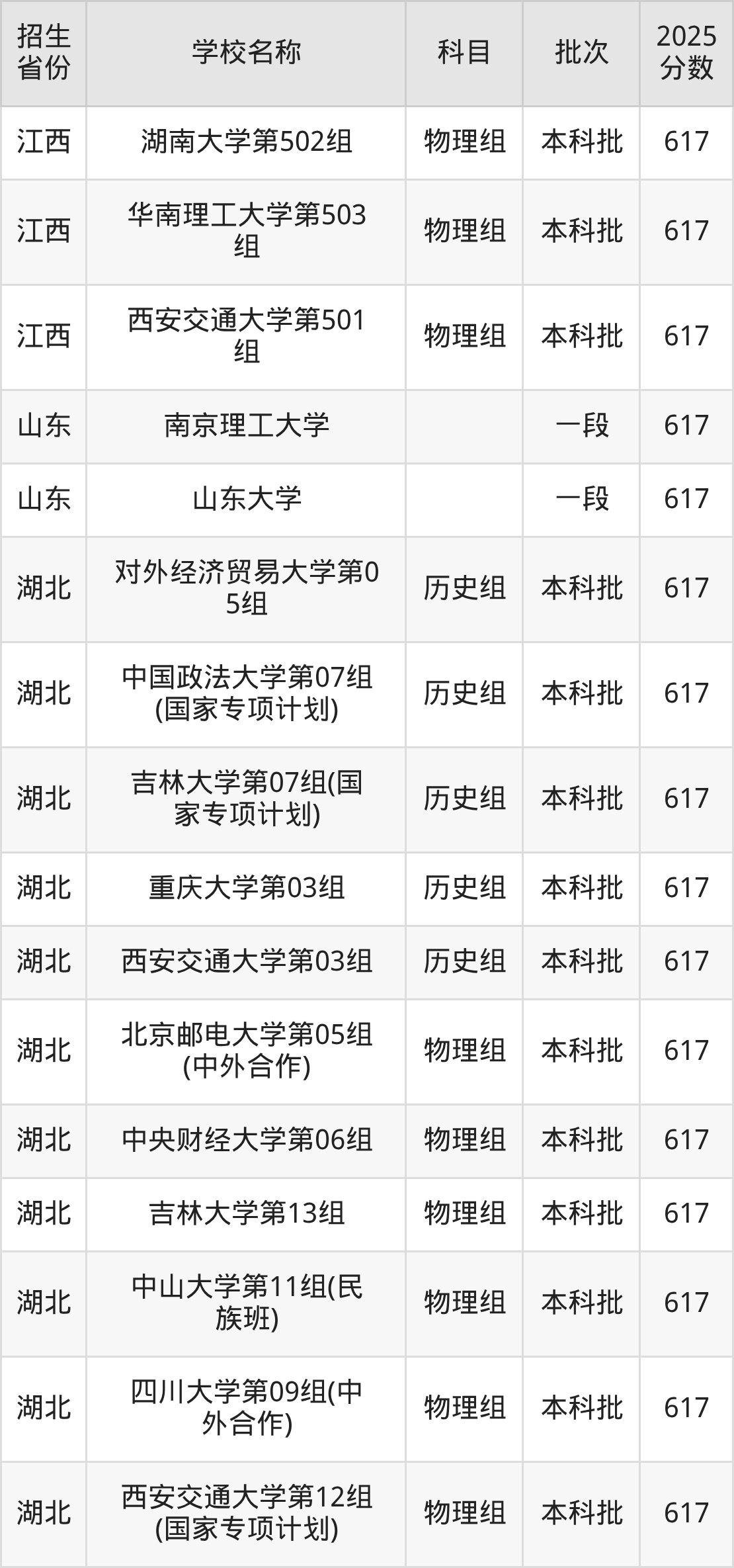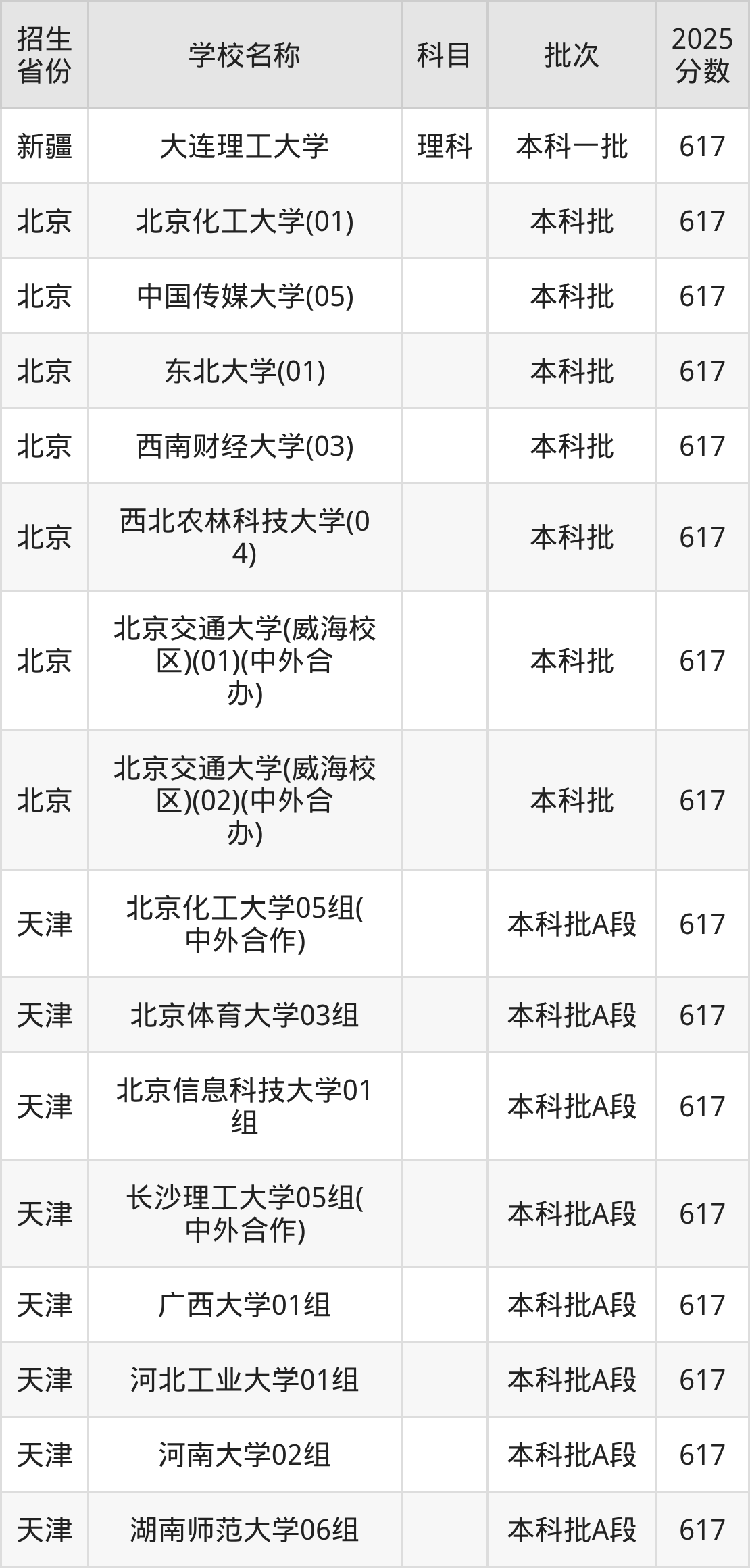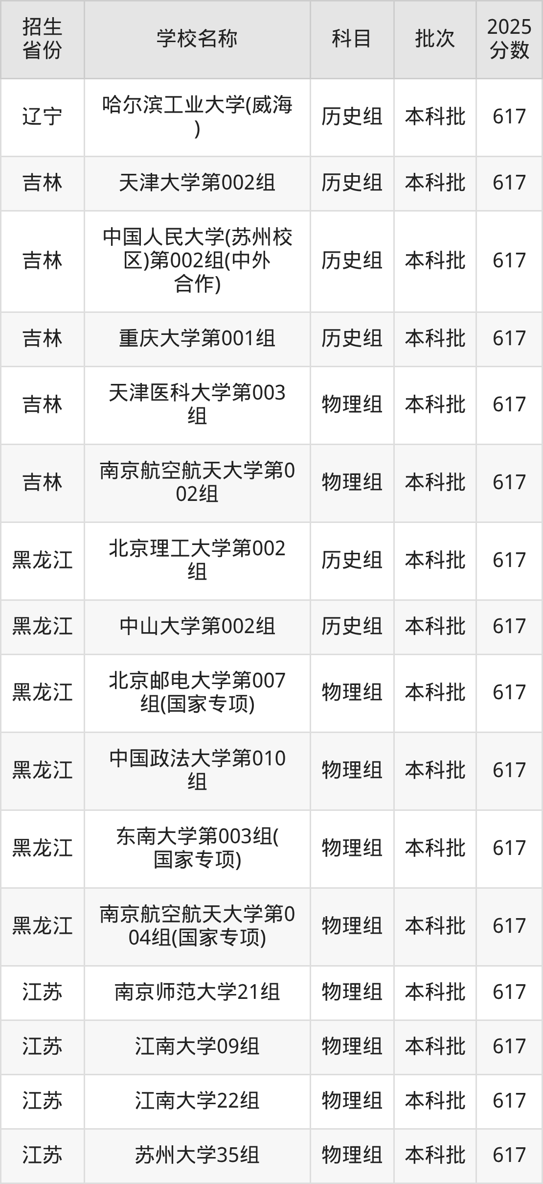二、各省617分的重点大学名单