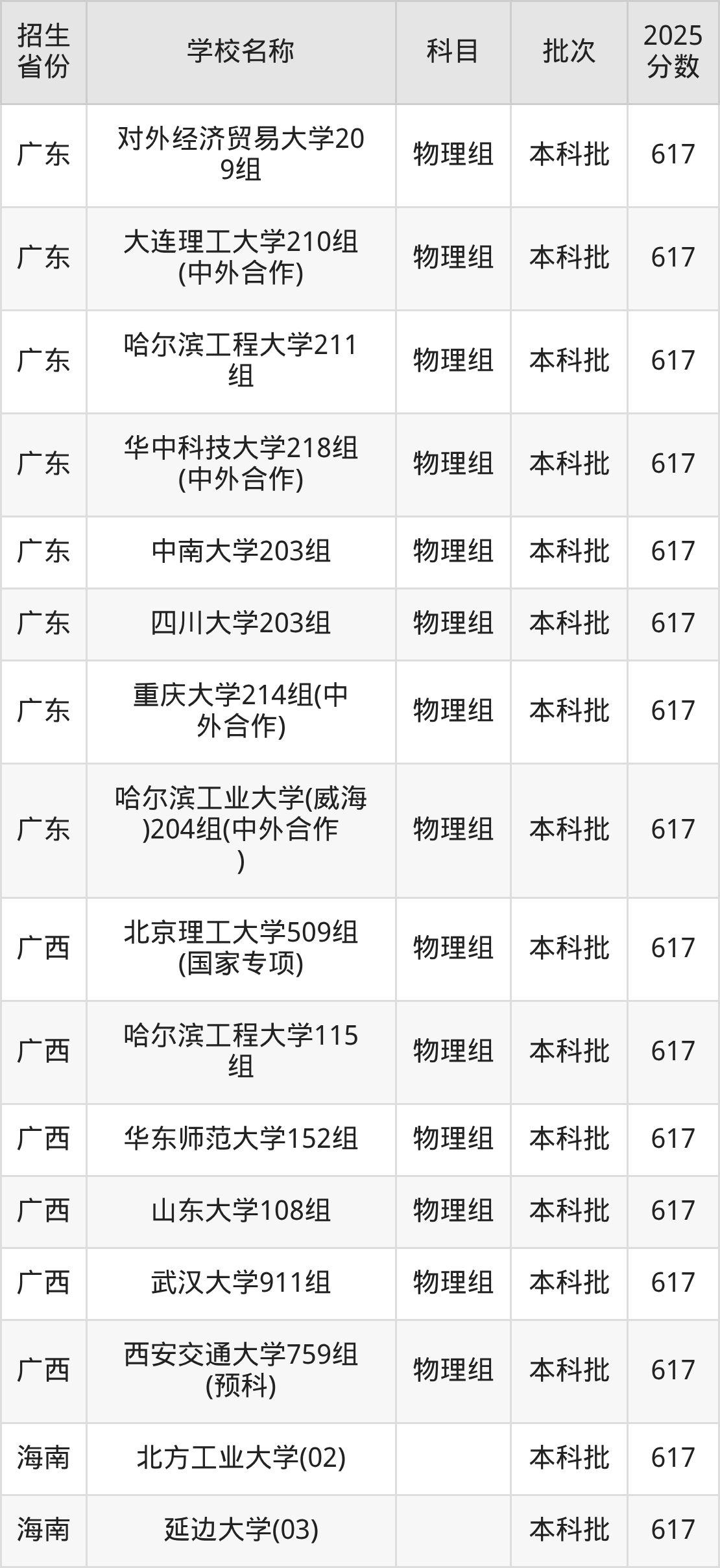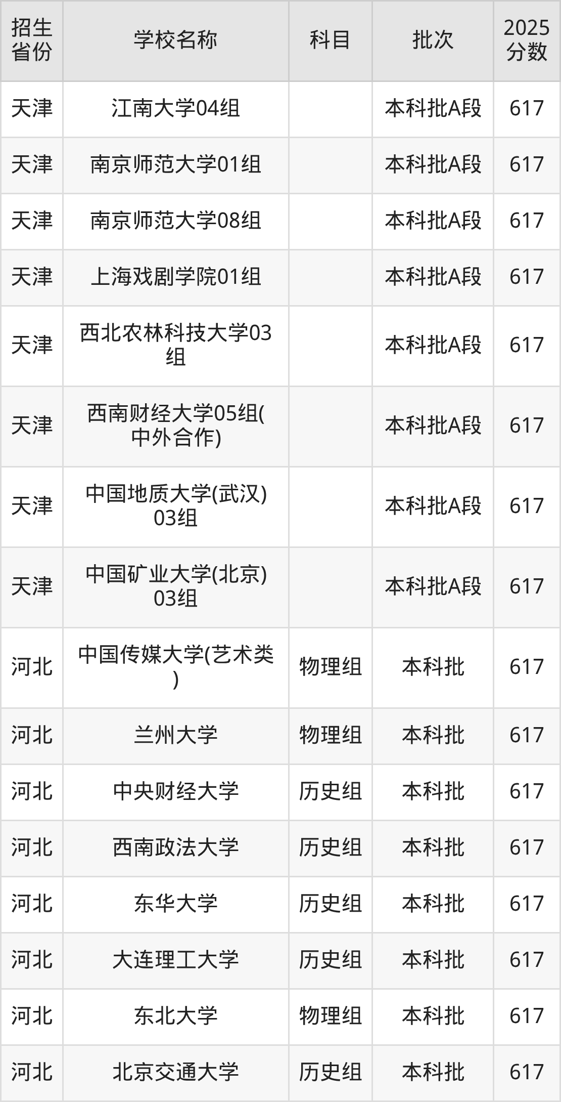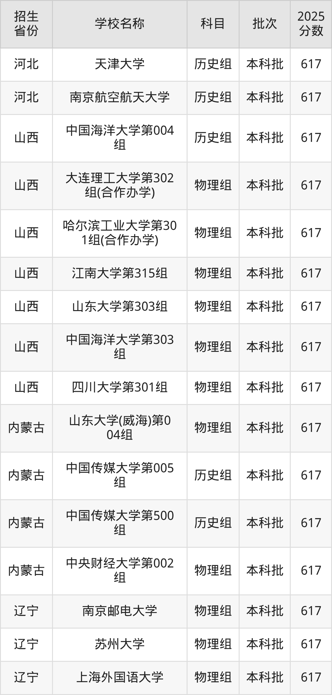 筛选全国各省2025年录取分数线为617分的重点大学如下: