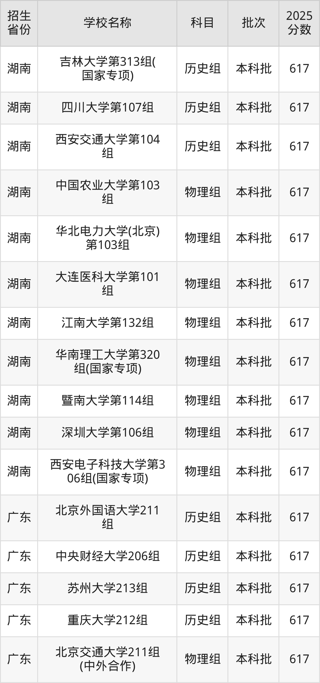 湖南省历史组分数线是617分的重点大学有:吉林大学、四川大学、西安交通大学。