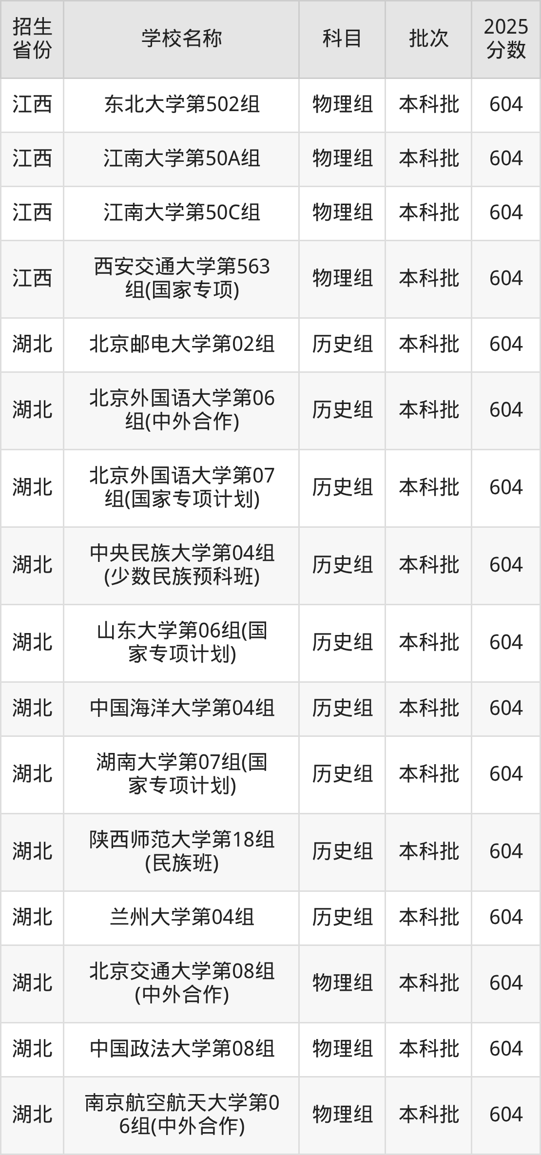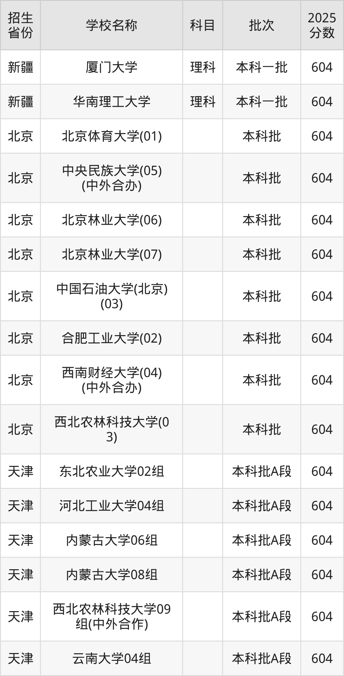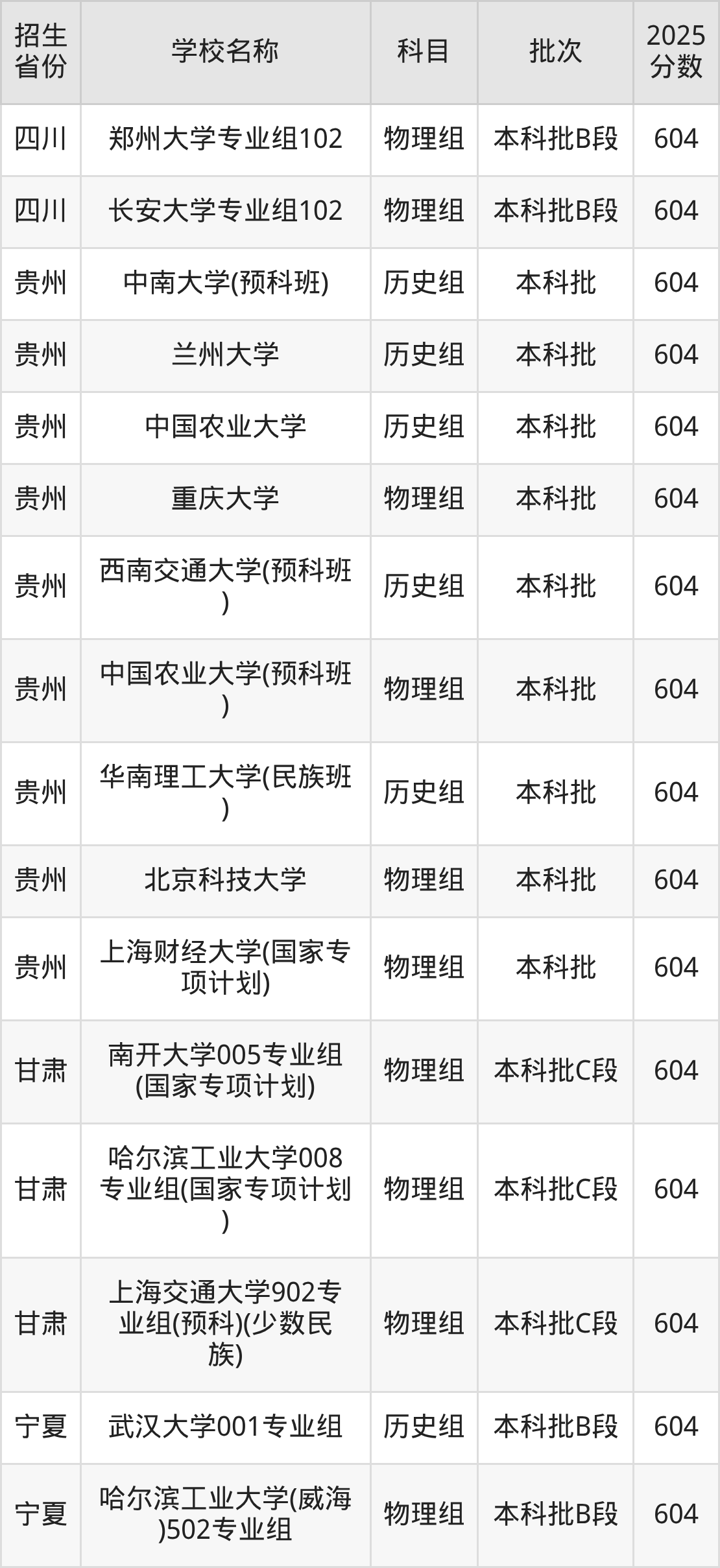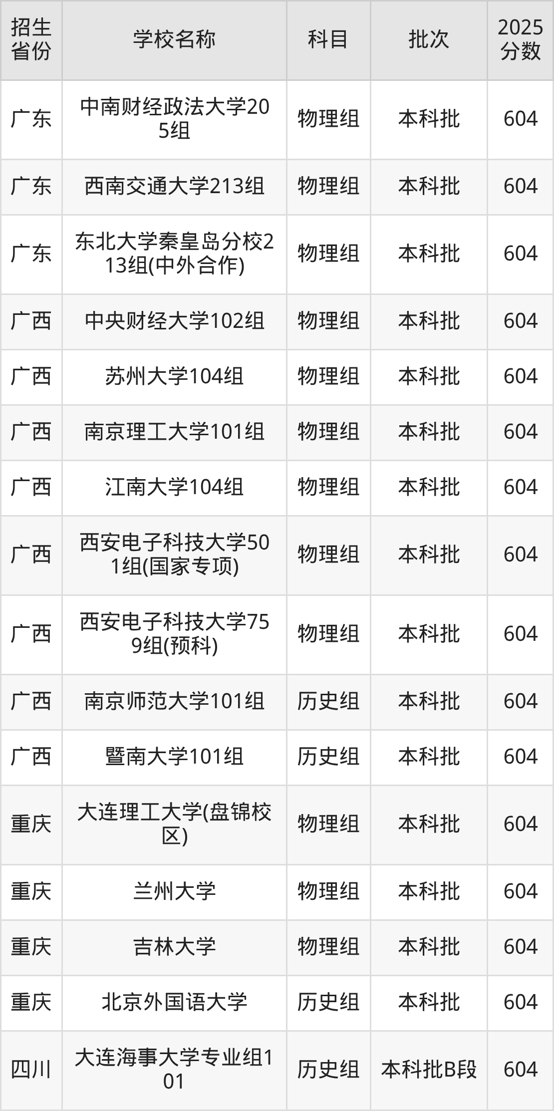 二、各省604分的211大学名单