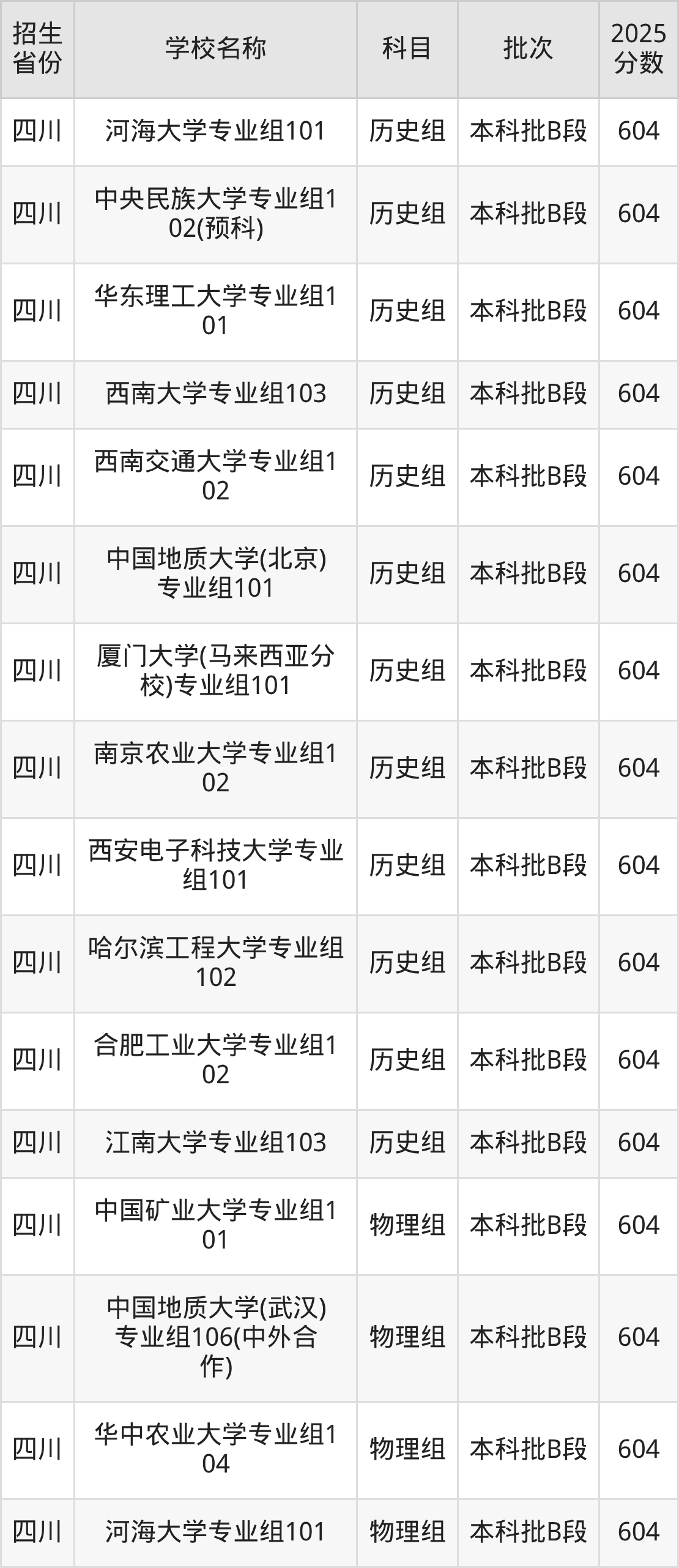 四川省历史组分数线是604分的211大学有:大连海事大学、河海大学、中央民族大学、华东理工大学、西南大学、西南交通大学、中国地质大学(北京)、厦门大学(马来西亚分校)、南京农业大学、西安电子科技大学。
