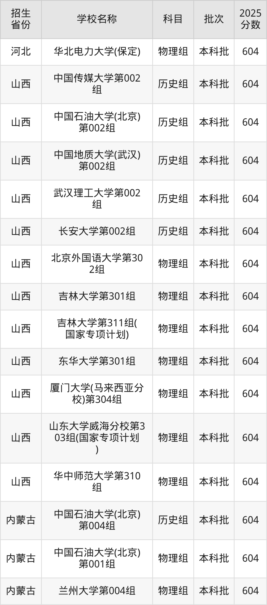 山西省历史组分数线是604分的211大学有:中国传媒大学、中国石油大学(北京)、中国地质大学(武汉)、武汉理工大学、长安大学。