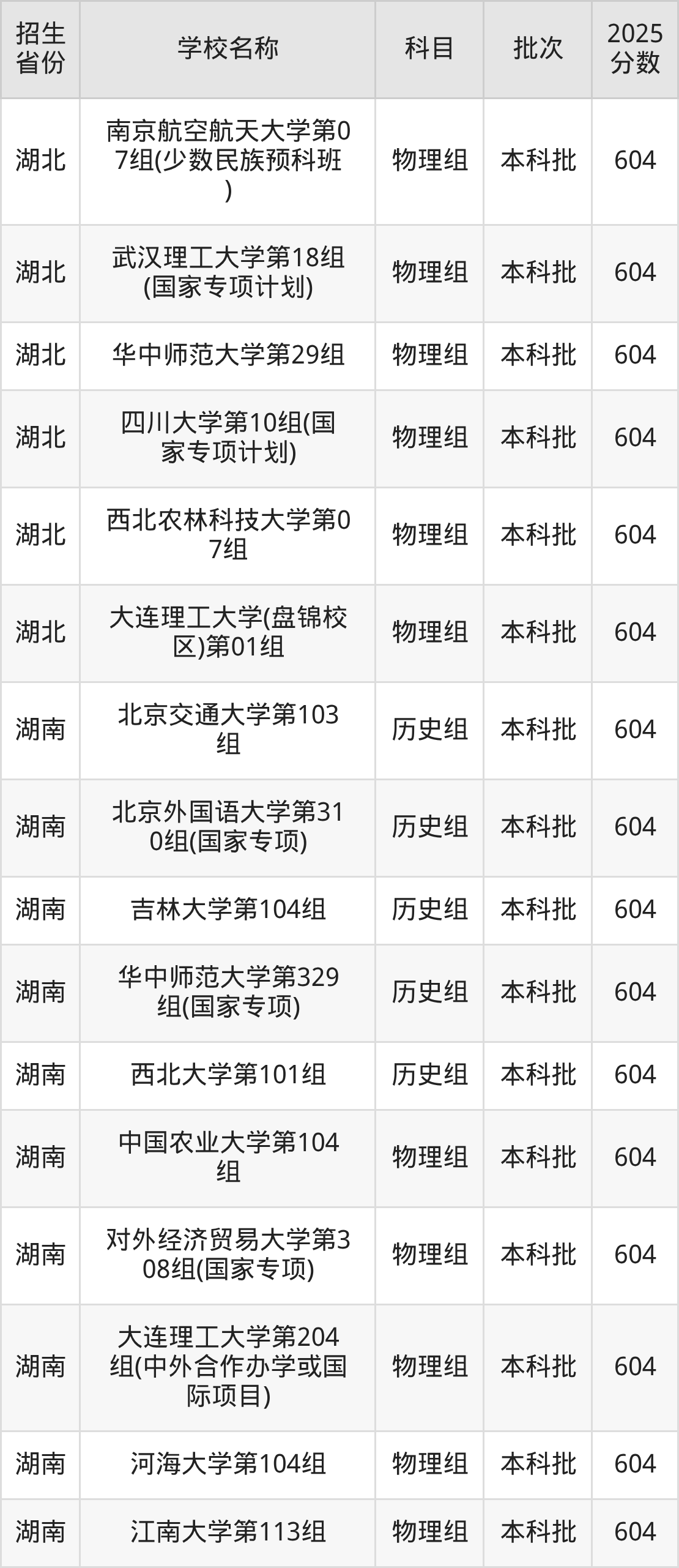 湖南省历史组分数线是604分的211大学有:北京交通大学、北京外国语大学、吉林大学、华中师范大学、西北大学。