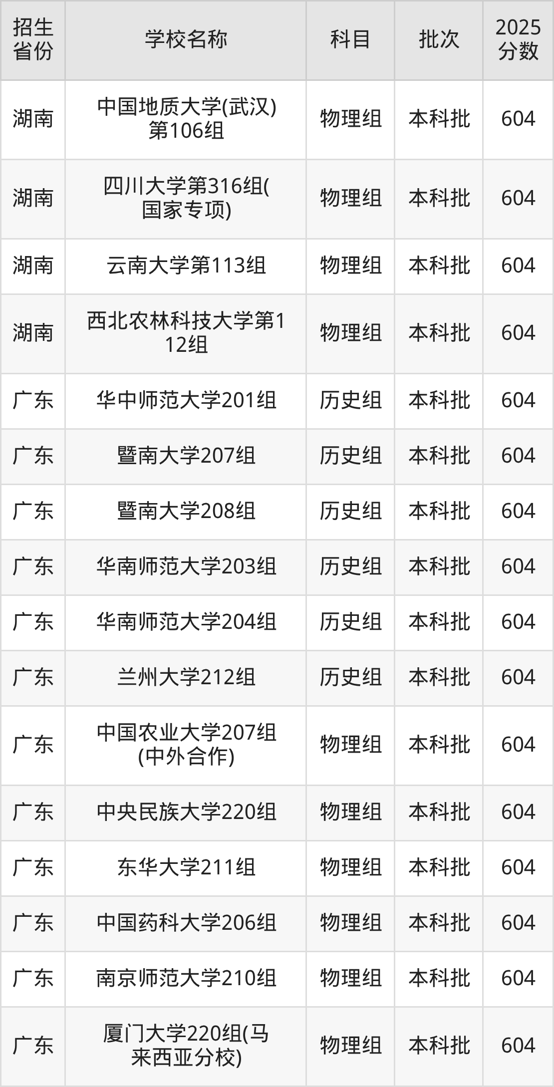 广东省历史组分数线是604分的211大学有:华中师范大学、暨南大学、华南师范大学、兰州大学。