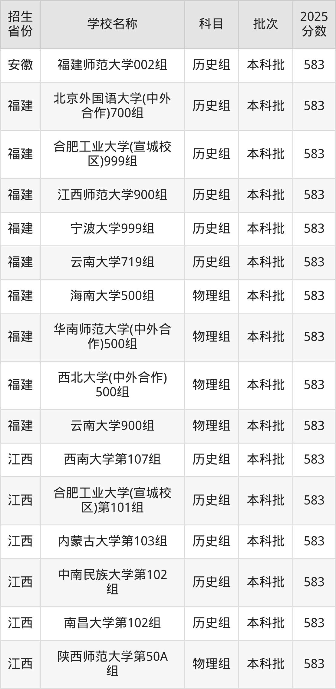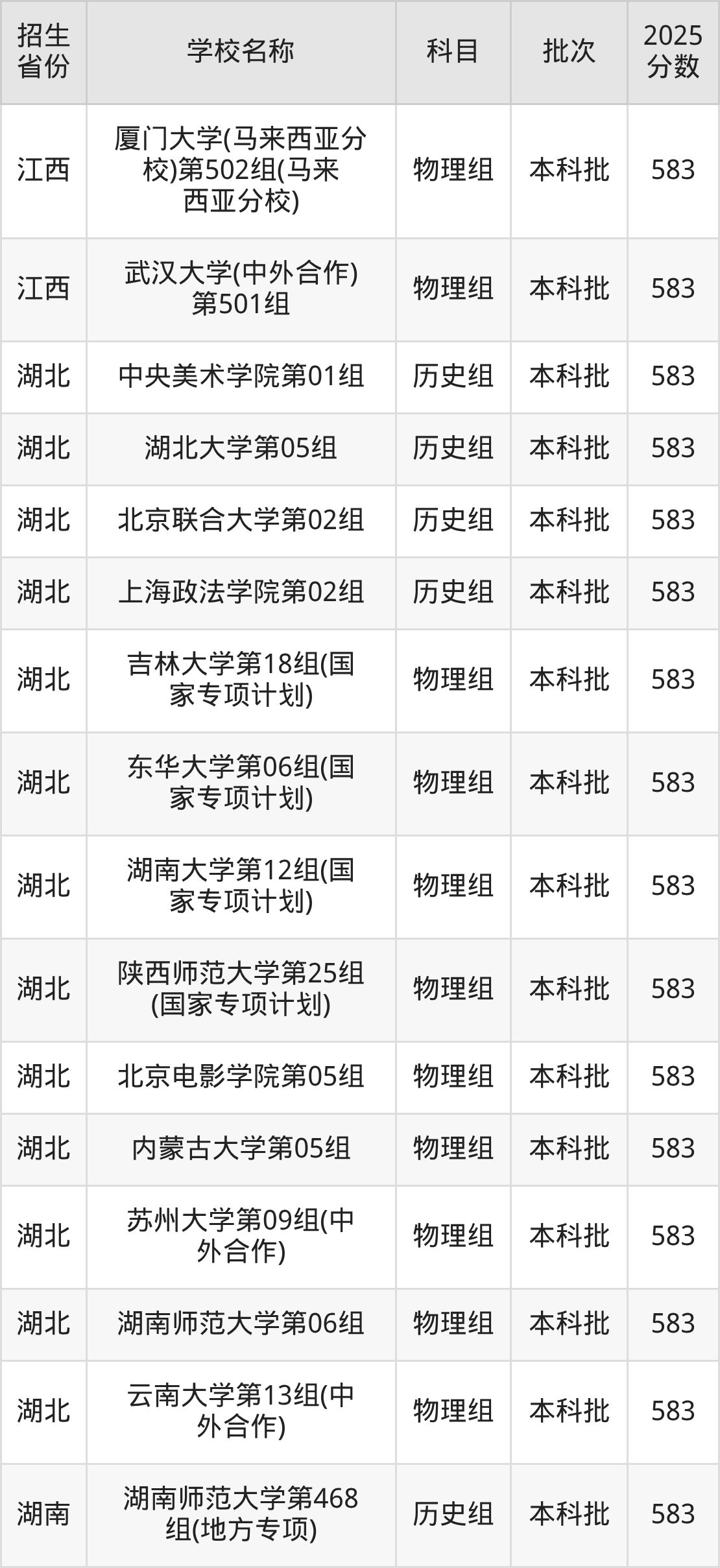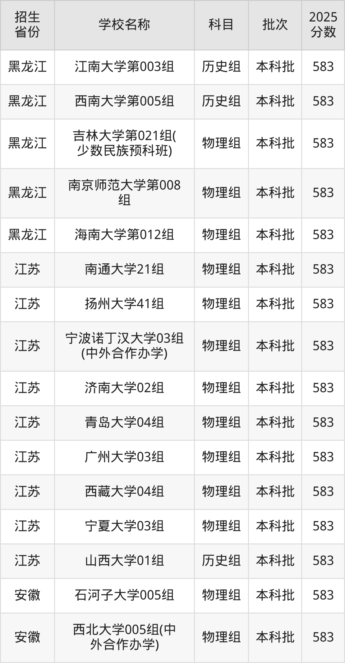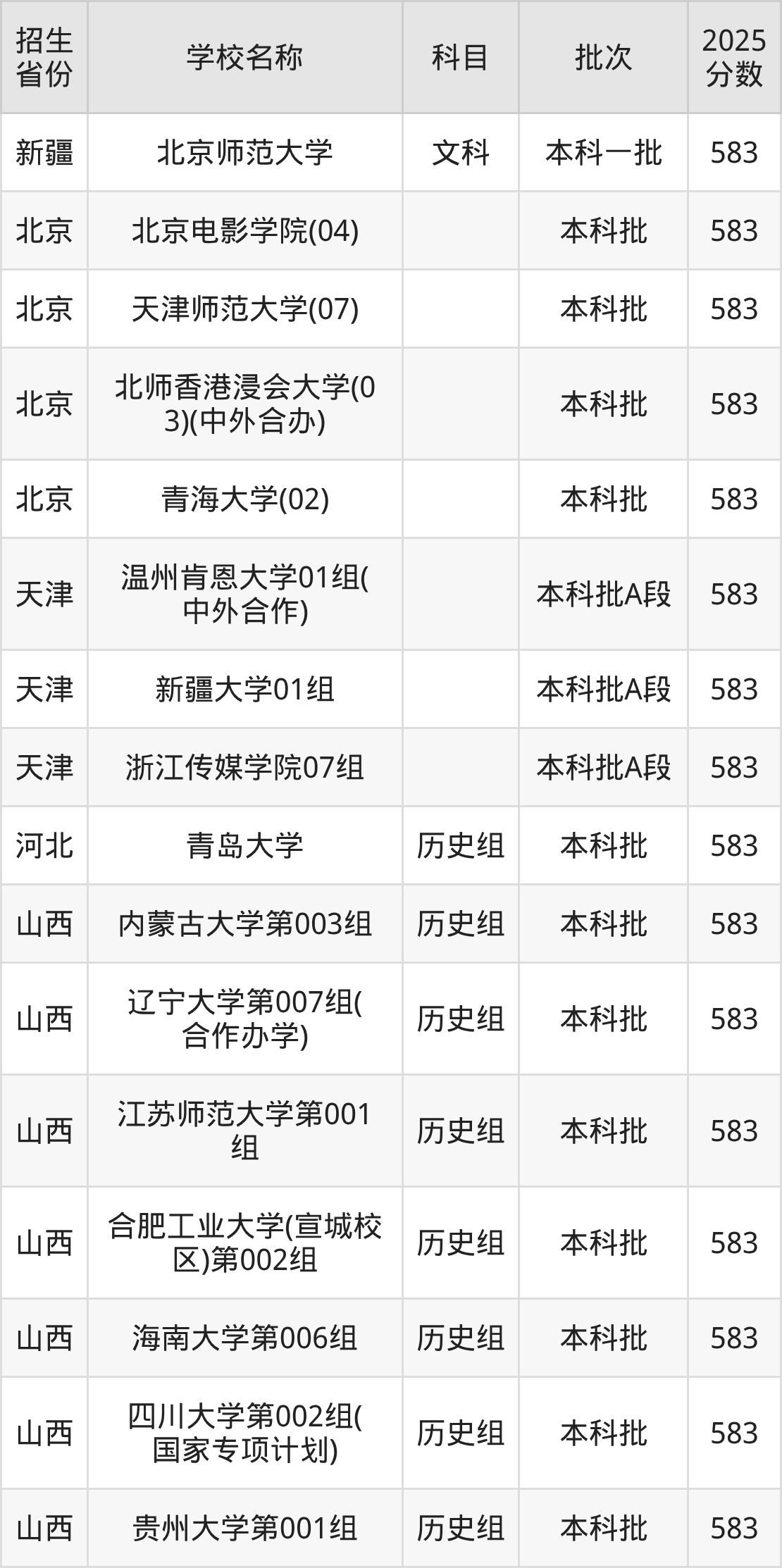 筛选全国各省2025年录取分数线为583分的文科大学如下: