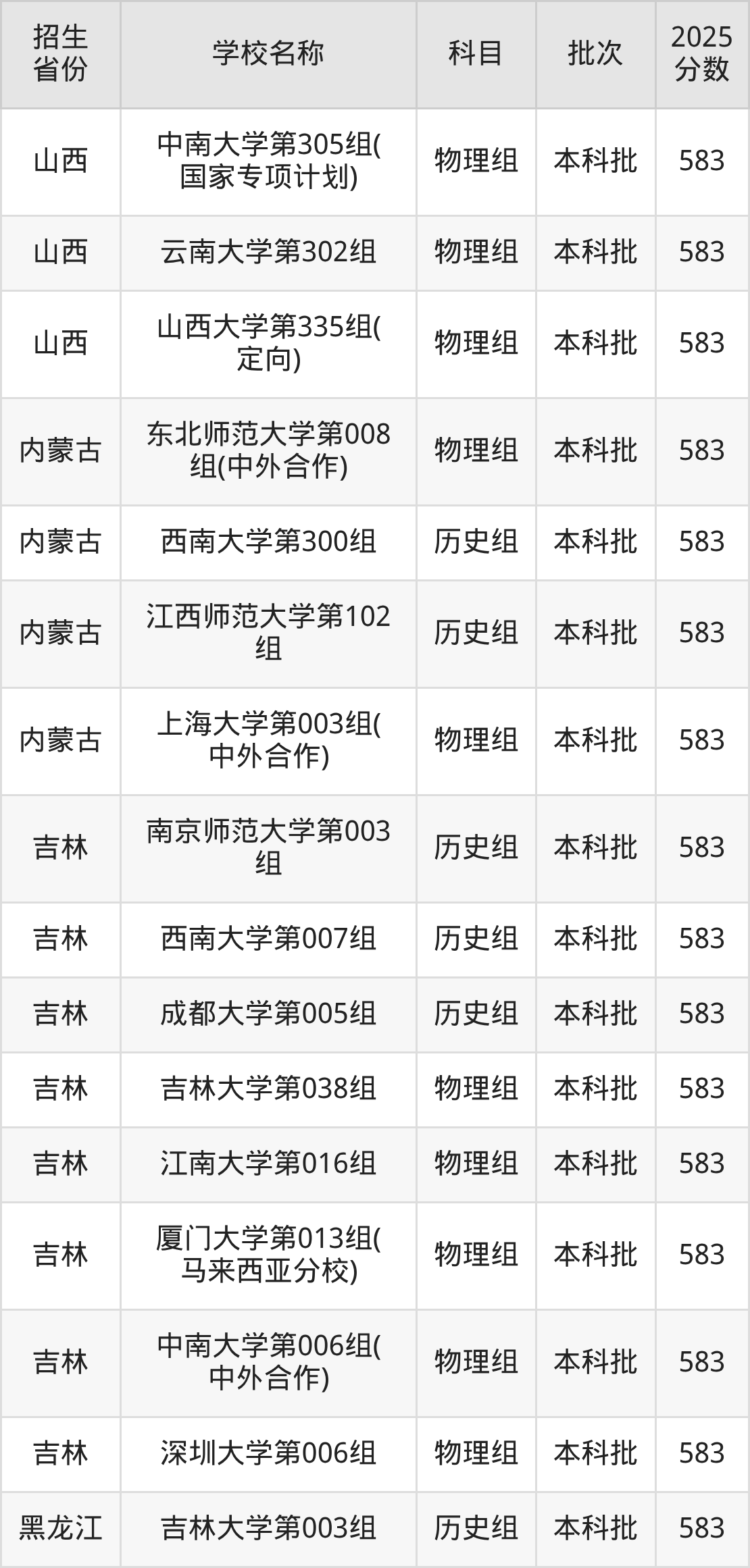 山西省物理组分数线是583分的文科大学有:中南大学、云南大学、山西大学。