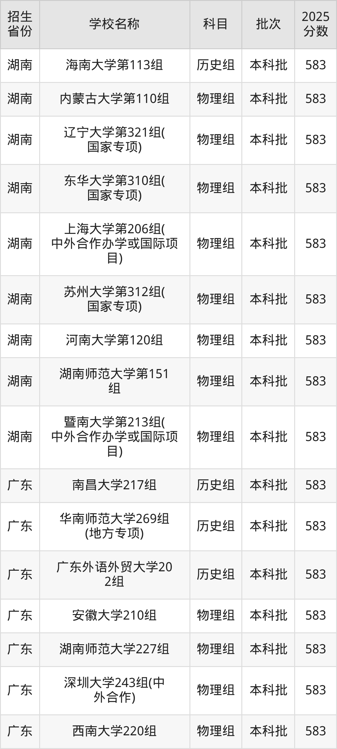广东省历史组分数线是583分的文科大学有:南昌大学、华南师范大学、广东外语外贸大学。