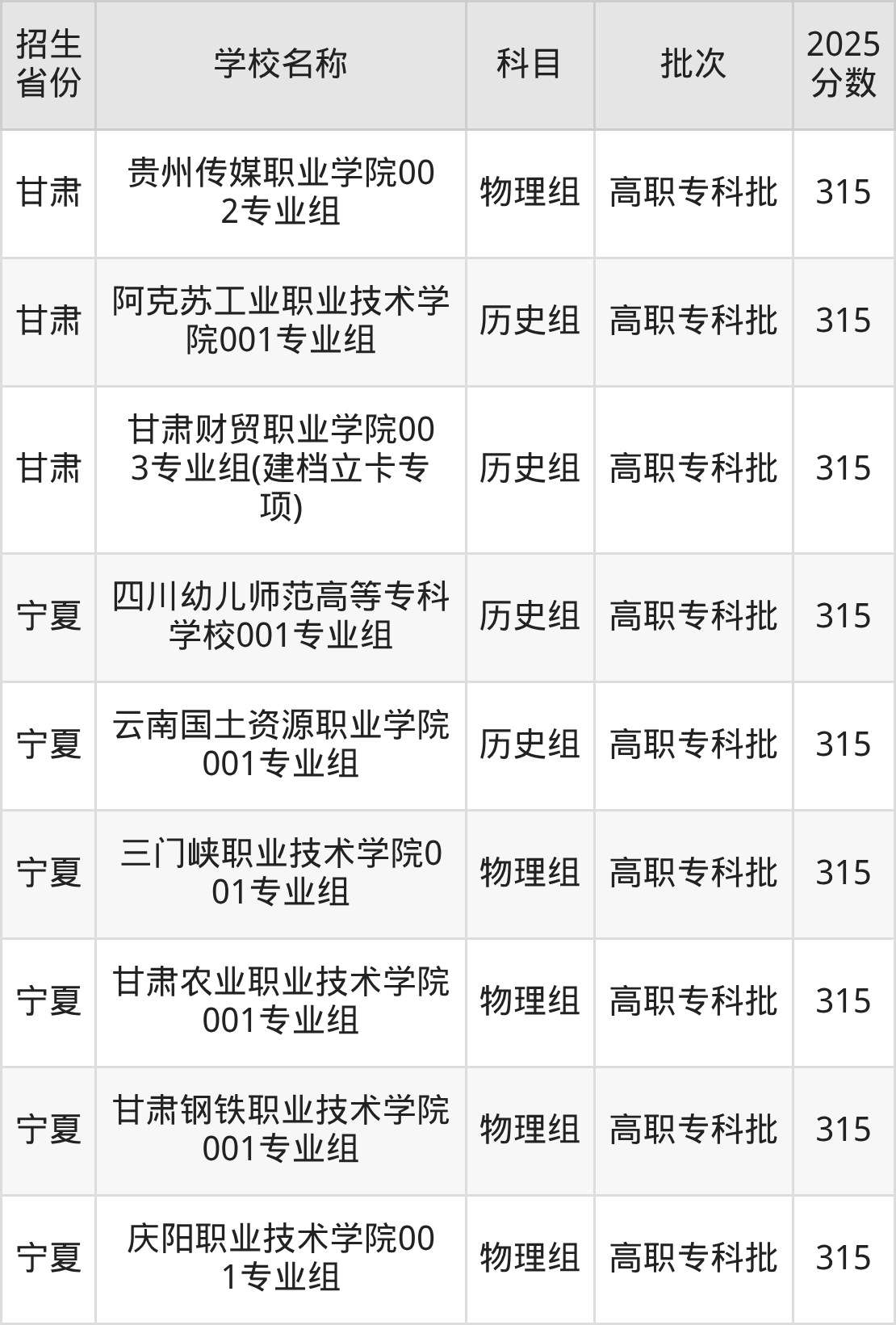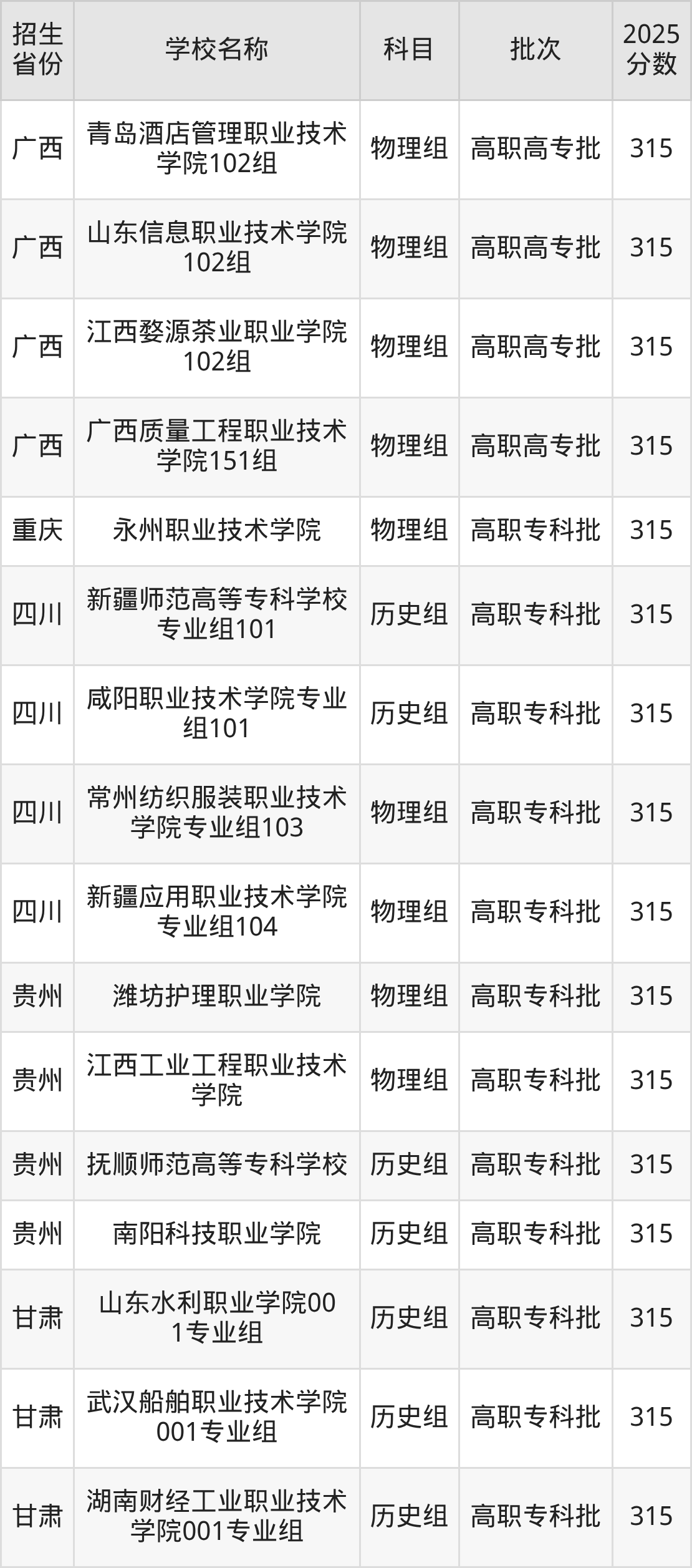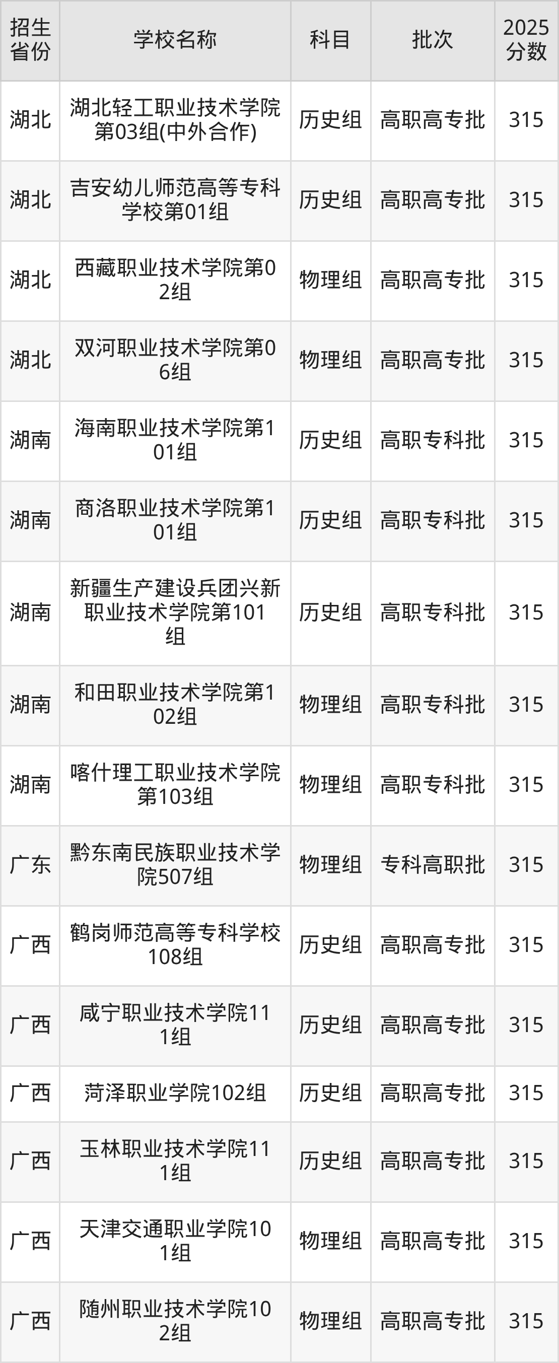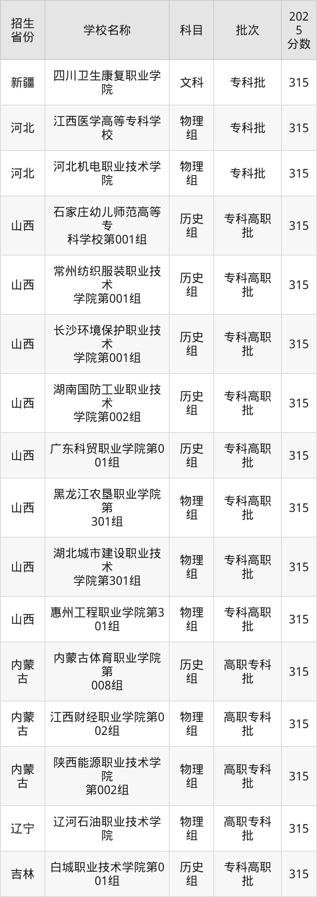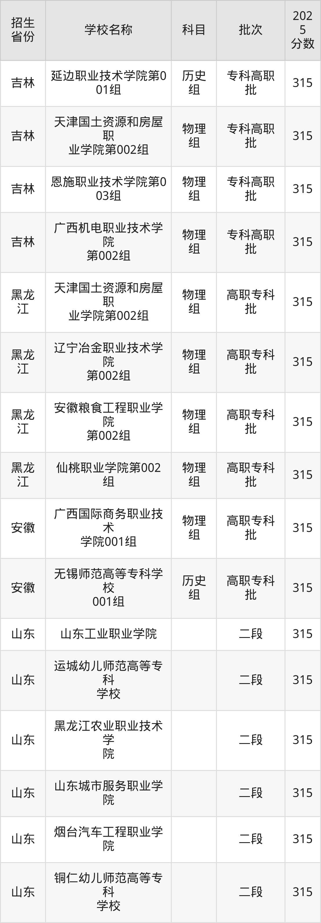 筛选全国各省2025年录取分数线为315分的公办专科大学如下: