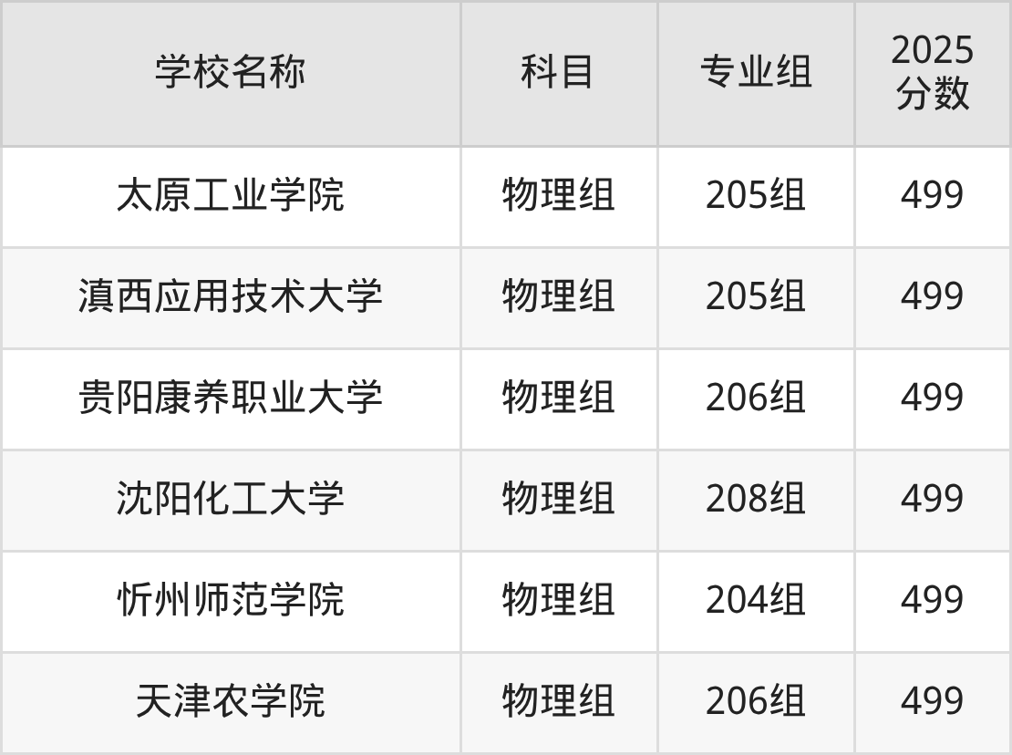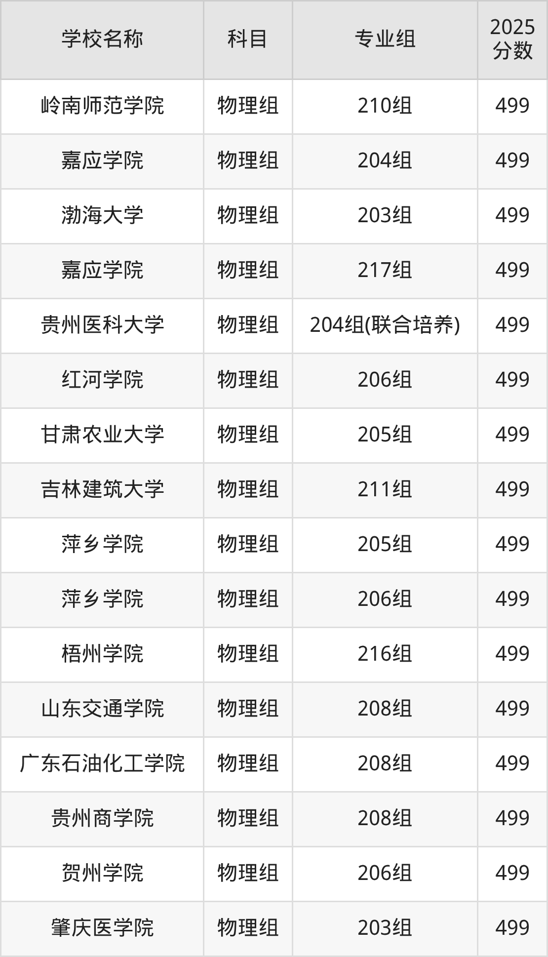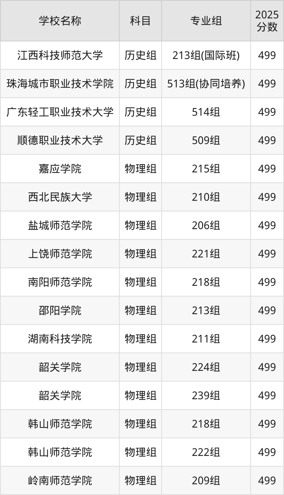 广东高考录取分数线在499分左右的公办院校专业组一共有38个,其中历史组有:江西科技师范大学(499分)、珠海城市职业技术学院(499分)、广东轻工职业技术大学(499分),物理组有:嘉应学院(499分)、西北民族大学(499分)、盐城师范学院(499分)。