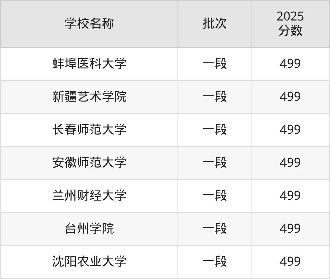 山东高考录取分数线在499分左右的公办大学一共有7所。分别是蚌埠医科大学(499分)、新疆艺术学院(499分)、长春师范大学(499分)