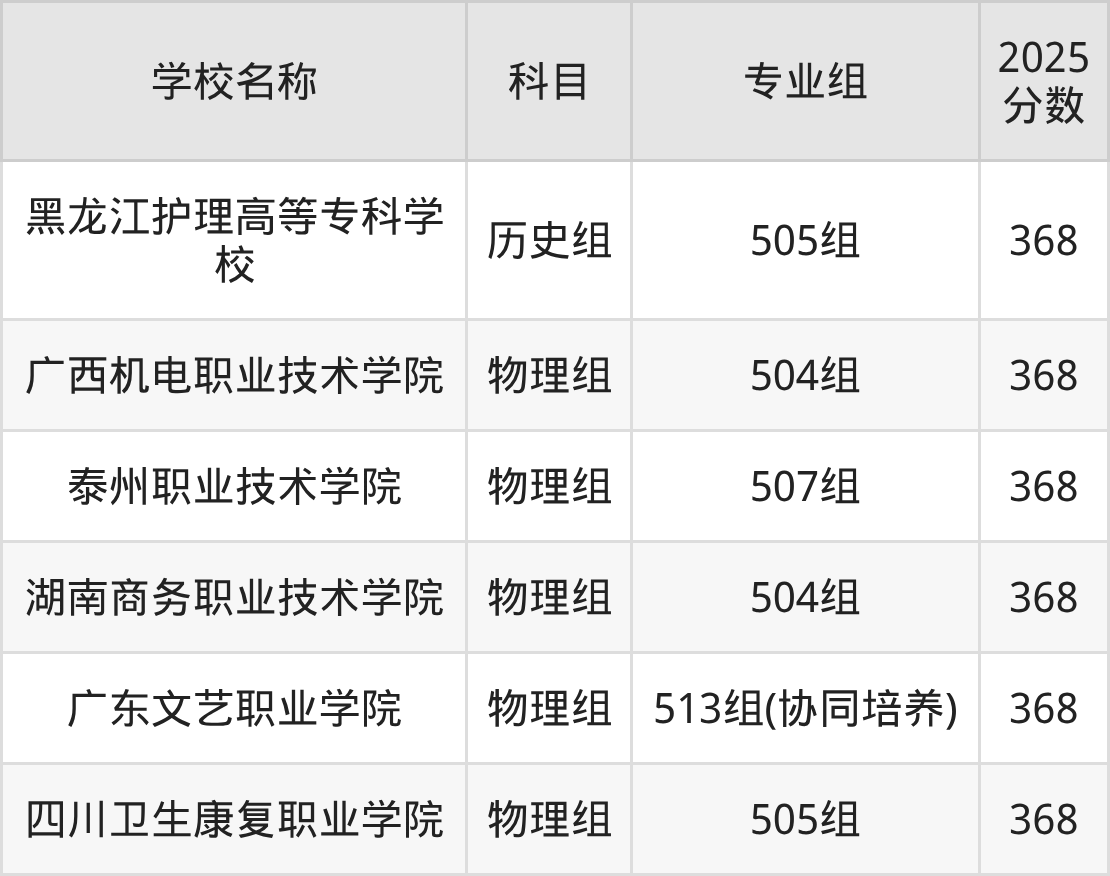 广东高考录取分数线在368分左右的公办院校专业组一共有6个,其中历史组有:黑龙江护理高等专科学校(368分),物理组有:广西机电职业技术学院(368分)、泰州职业技术学院(368分)、湖南商务职业技术学院(368分)。