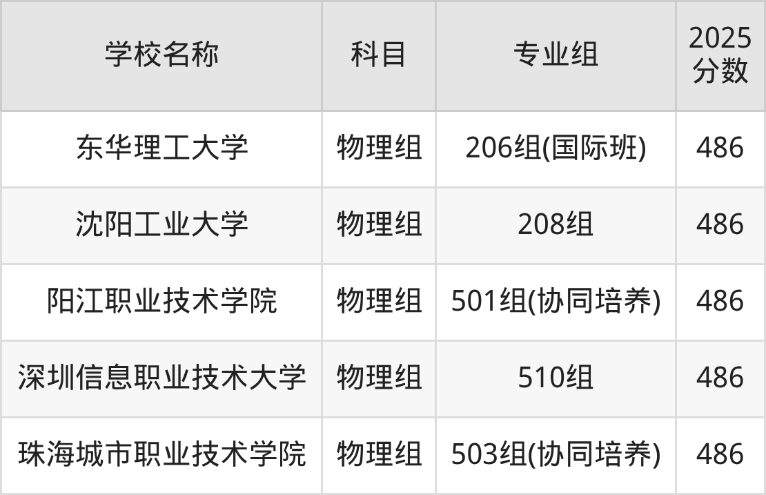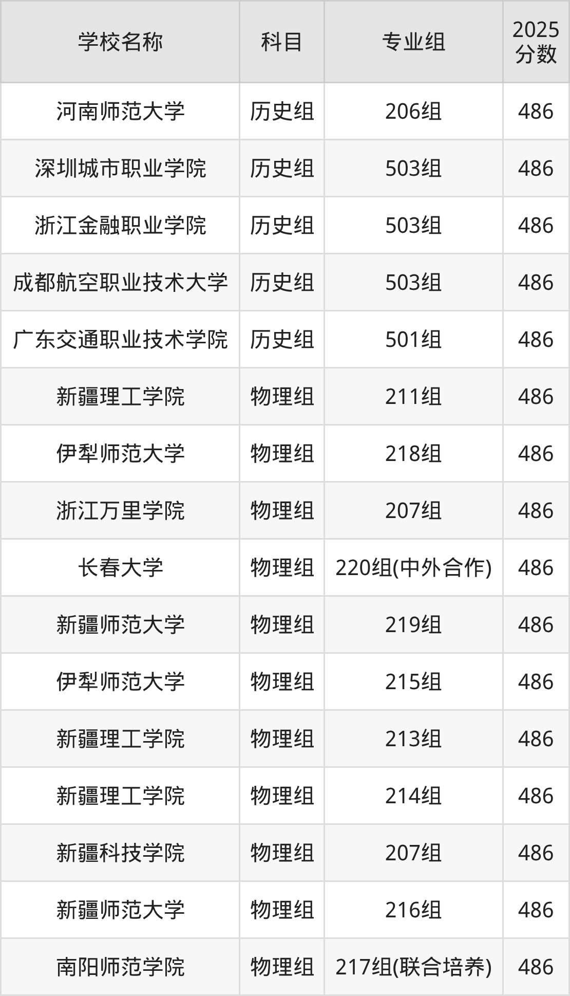 广东高考录取分数线在486分左右的公办院校专业组一共有21个,其中历史组有:河南师范大学(486分)、深圳城市职业学院(486分)、浙江金融职业学院(486分),物理组有:新疆理工学院(486分)、伊犁师范大学(486分)、浙江万里学院(486分)。