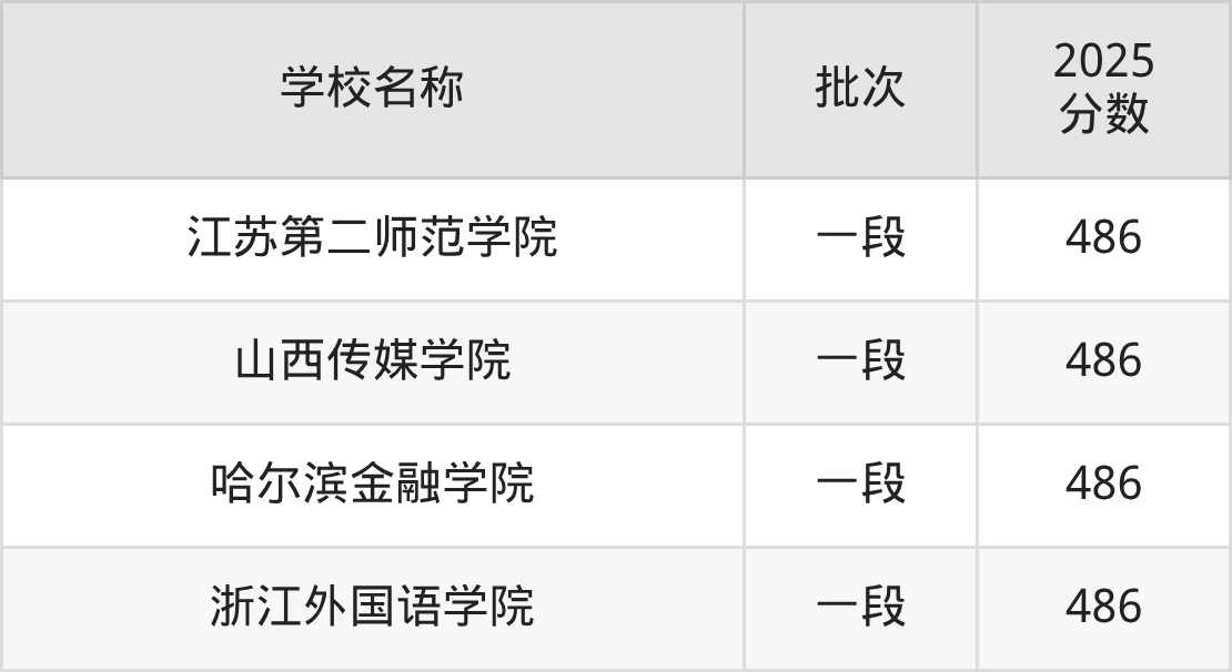 山东高考录取分数线在486分左右的公办大学一共有4所。分别是江苏第二师范学院(486分)、山西传媒学院(486分)、哈尔滨金融学院(486分)