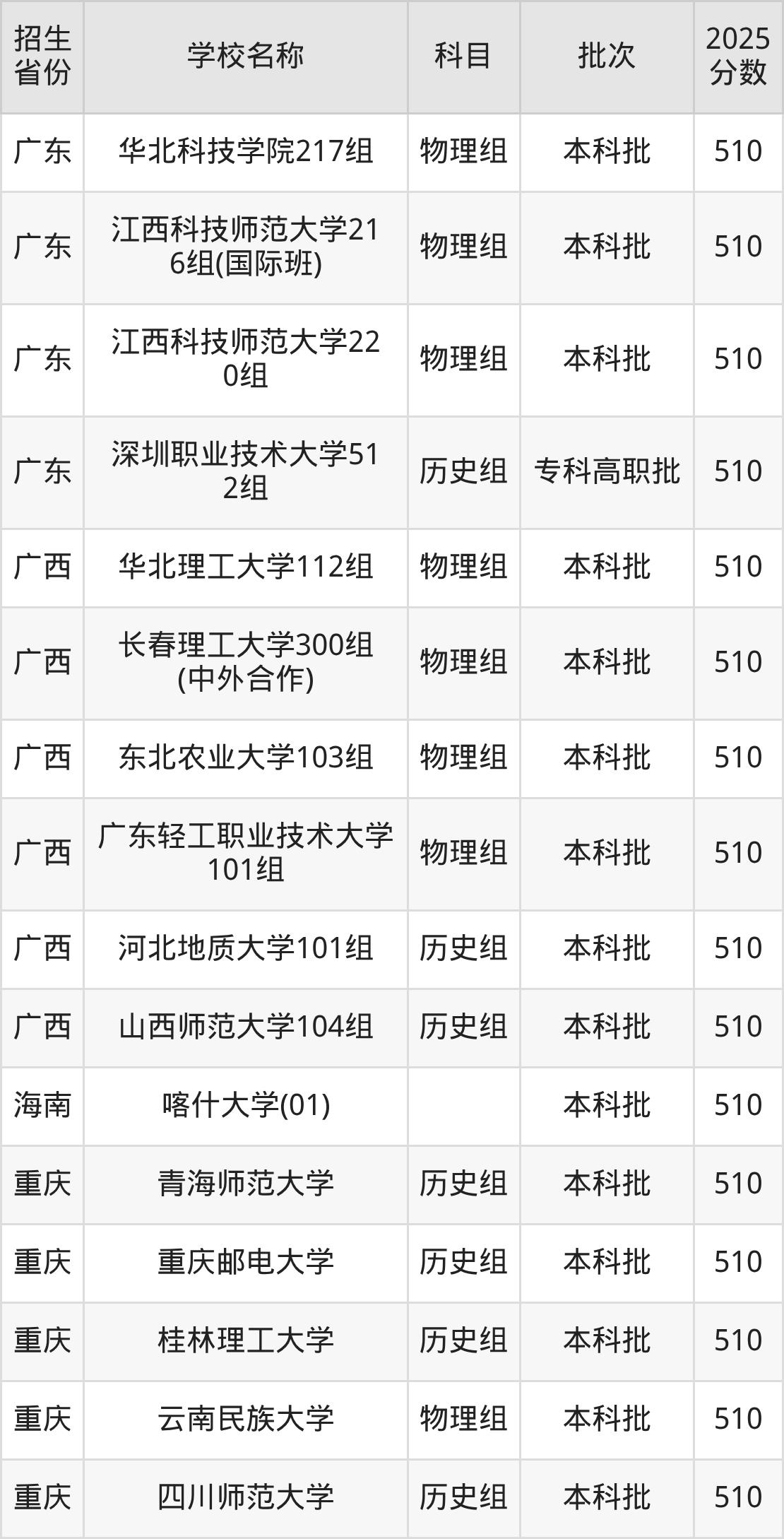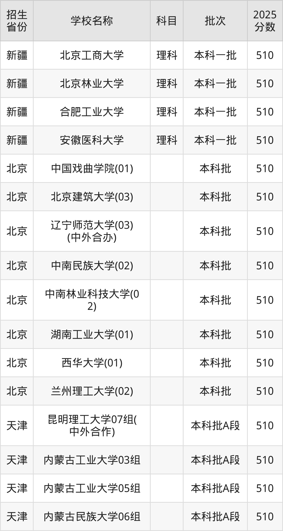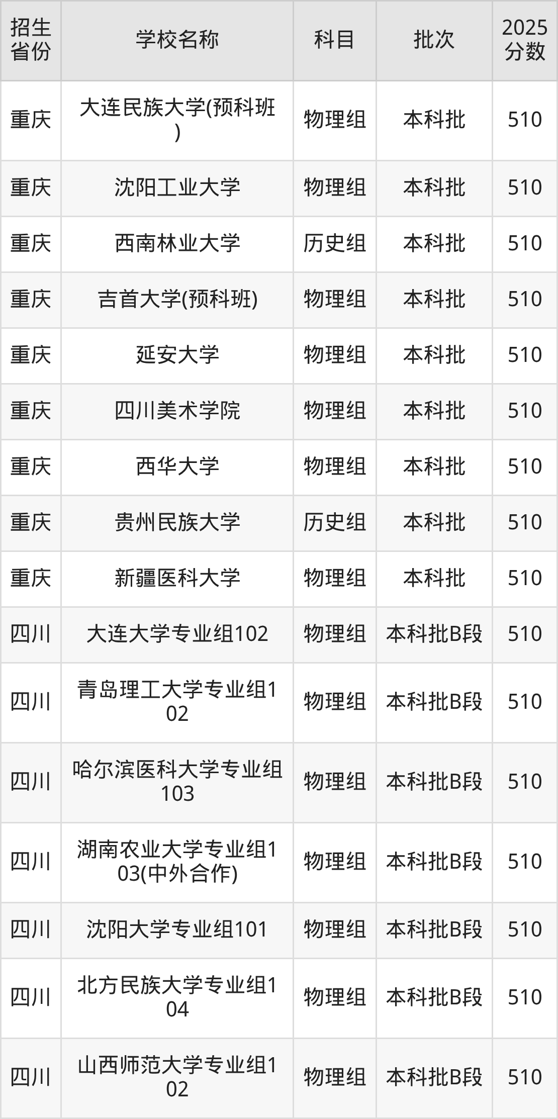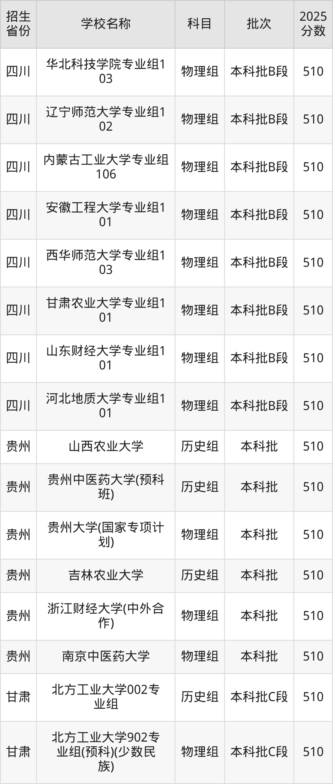 筛选全国各省2025年录取分数线为510分的重点大学如下: