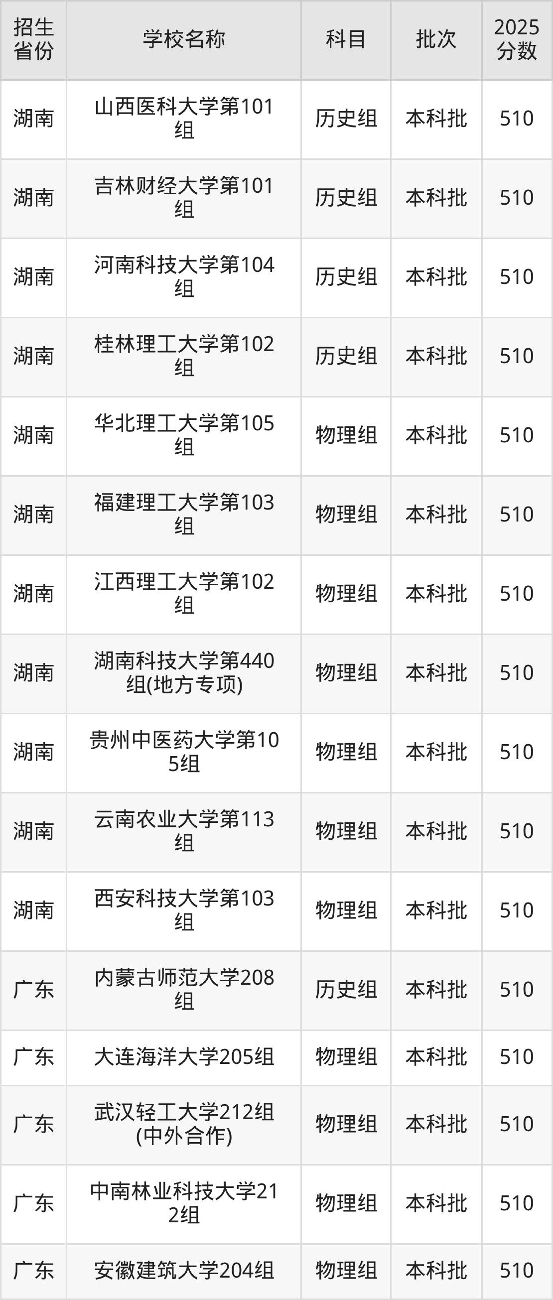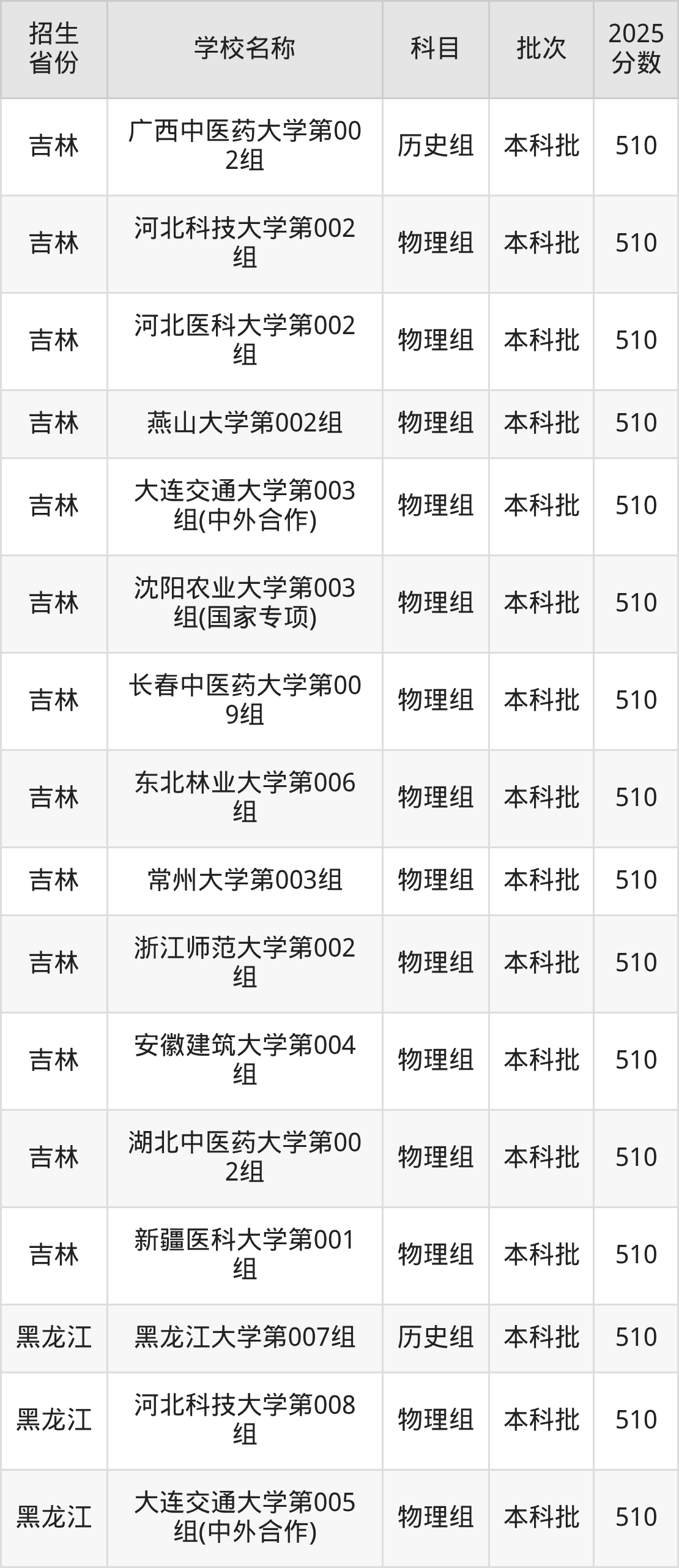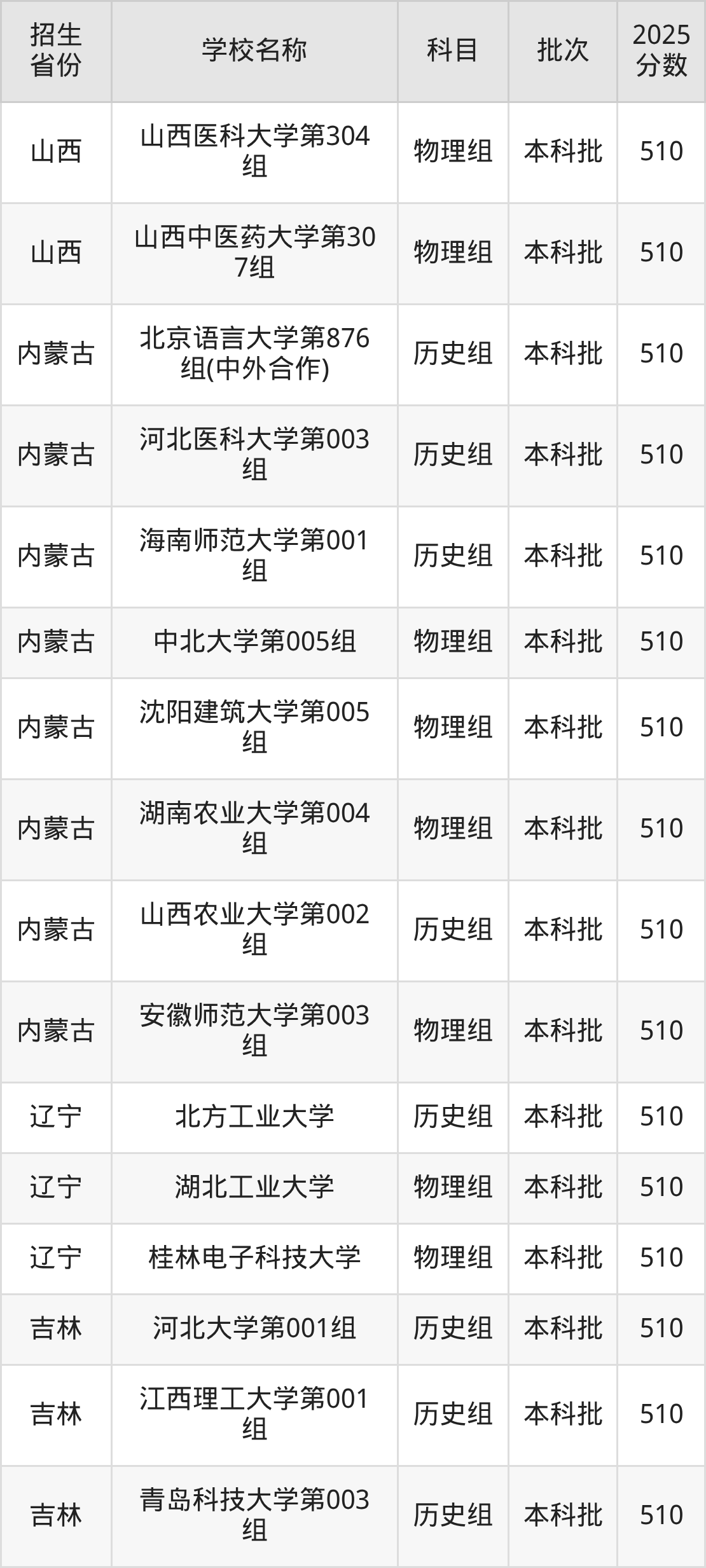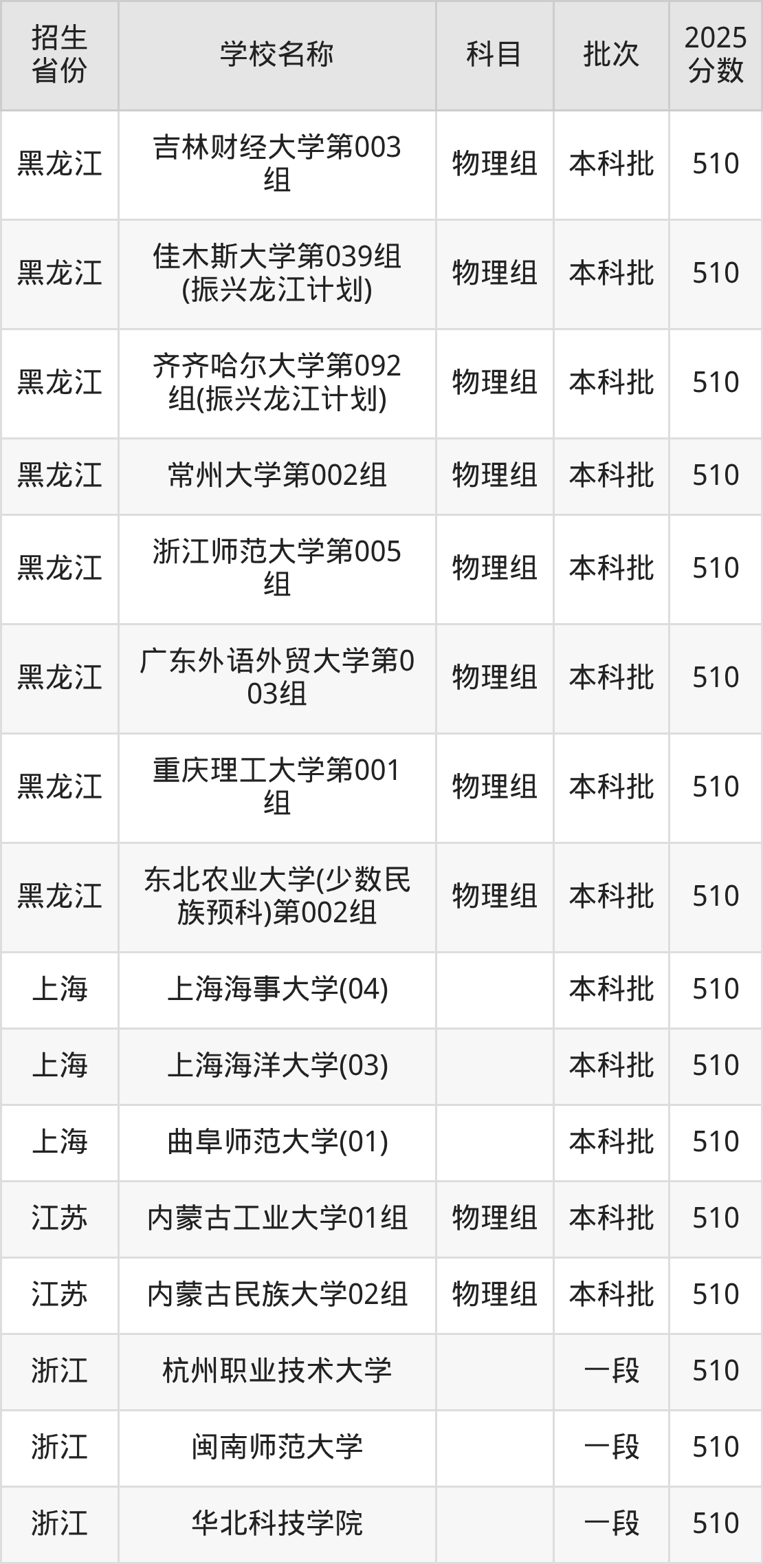 筛选全国各省2025年录取分数线为510分的重点大学如下: