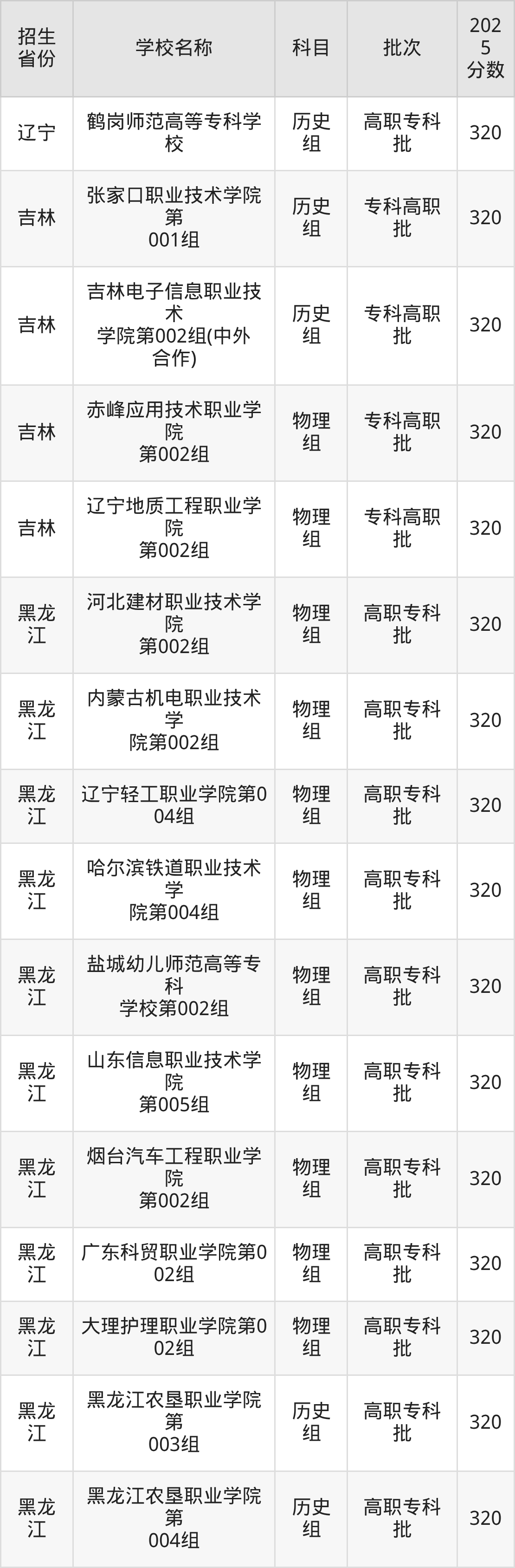 筛选全国各省2025年录取分数线为320分的公办专科大学如下: