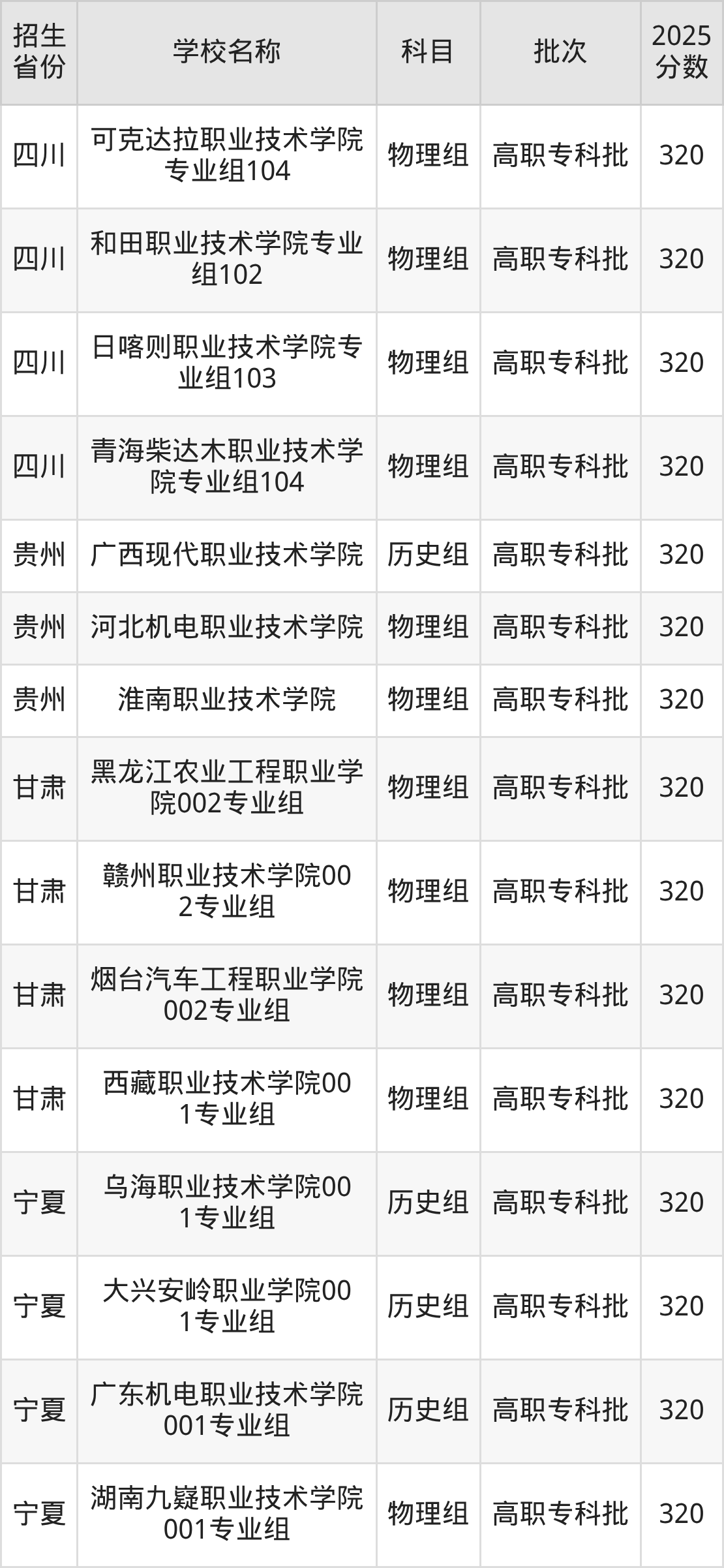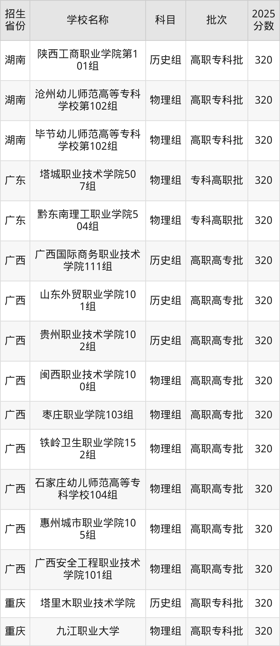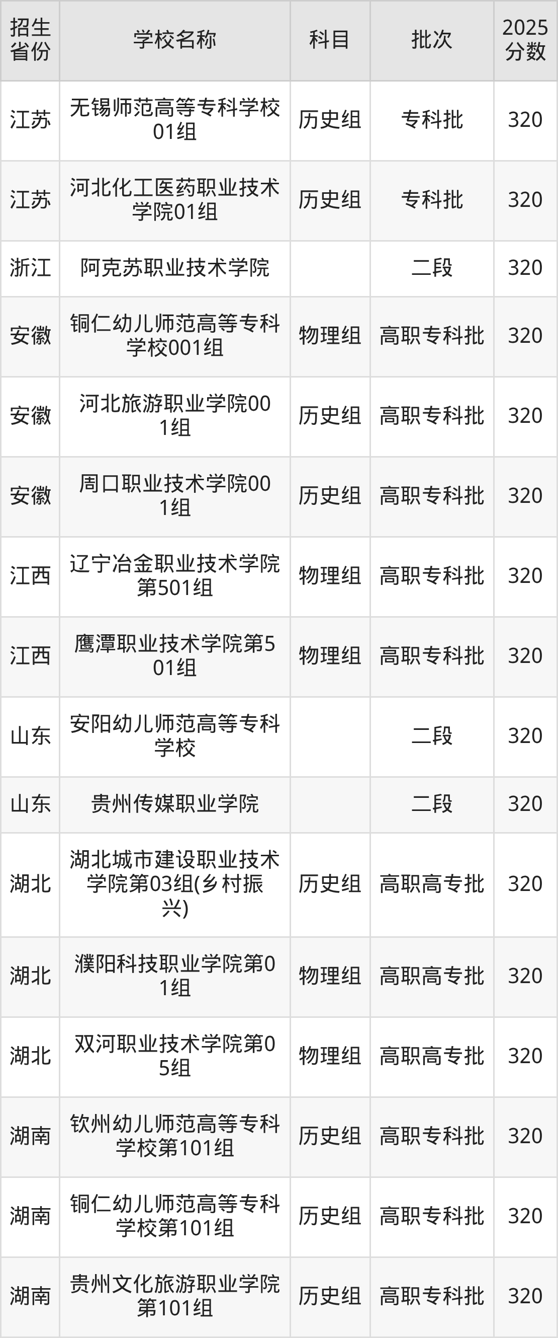 二、各省320分的公办专科大学名单
