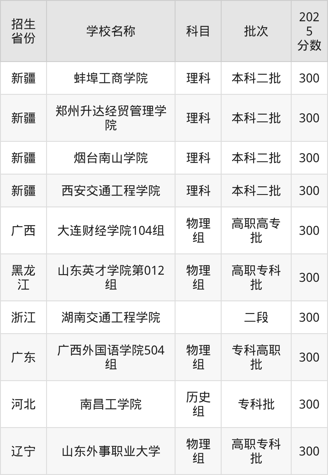 筛选全国各省2025年录取分数线为300分的二本民办大学如下: