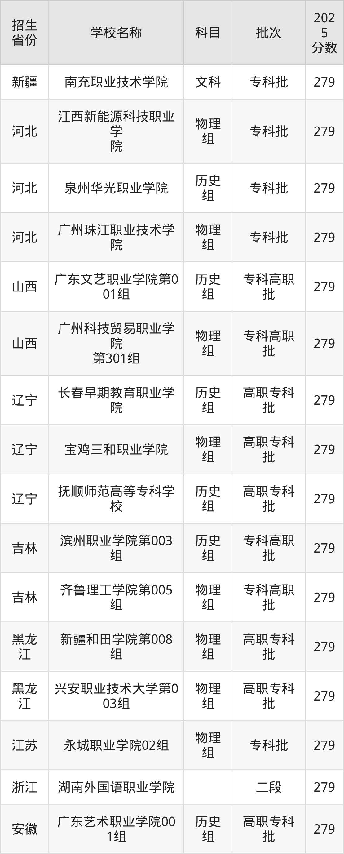 河北省物理组分数线是279分的文科大学有:江西新能源科技职业学院、广州珠江职业技术学院。